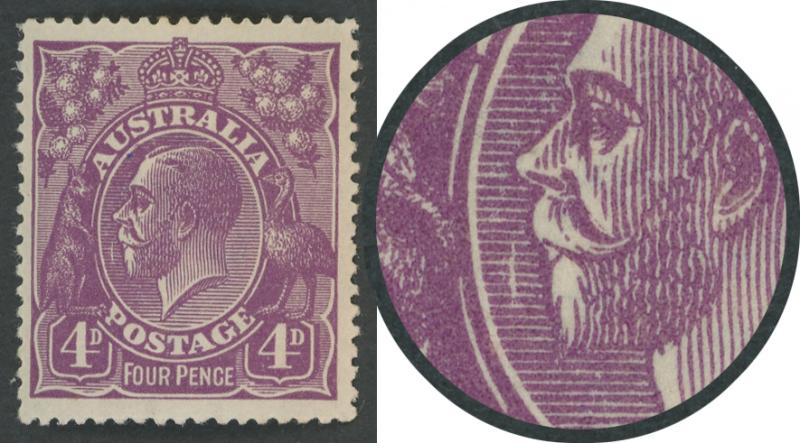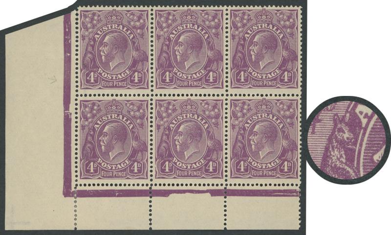 the crack extending into the Kangaroo, well-centred, light cds cancel clear of the variety, Cat $250+ for State I. The ACSC does not record this advanced state of the flaw in violet, only in blue. Ex Gerald Fon. (Image1) (Image2)
