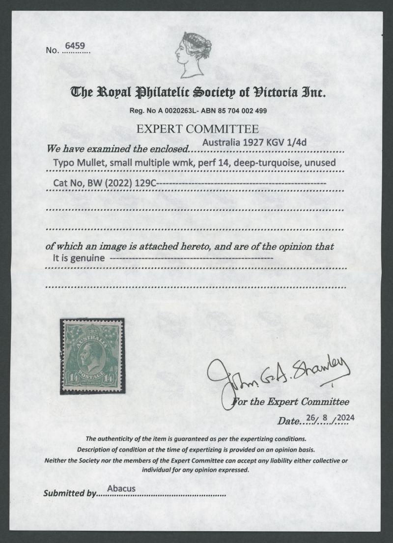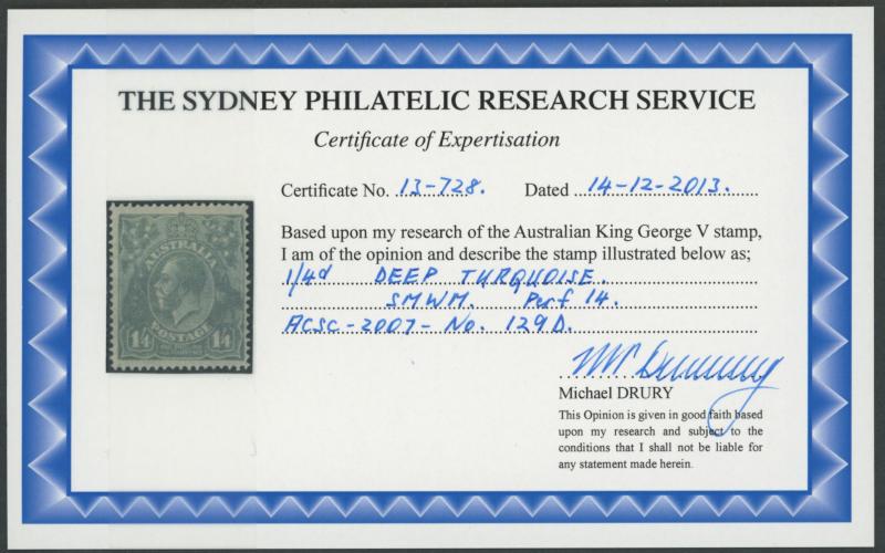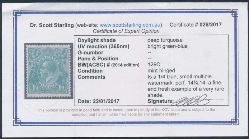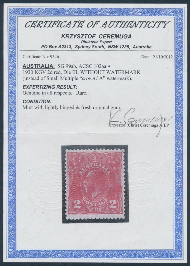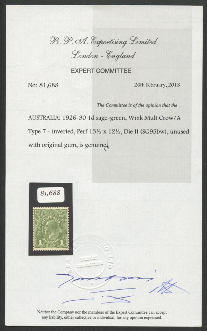 footnote 2 at page 102. BPA Certificate (2013). The ACSC states that stamps with inverted watermark are from coils but that "The variety in sheet form has been reported but is rare". A very attractive example of this scarce stamp, with no signs of