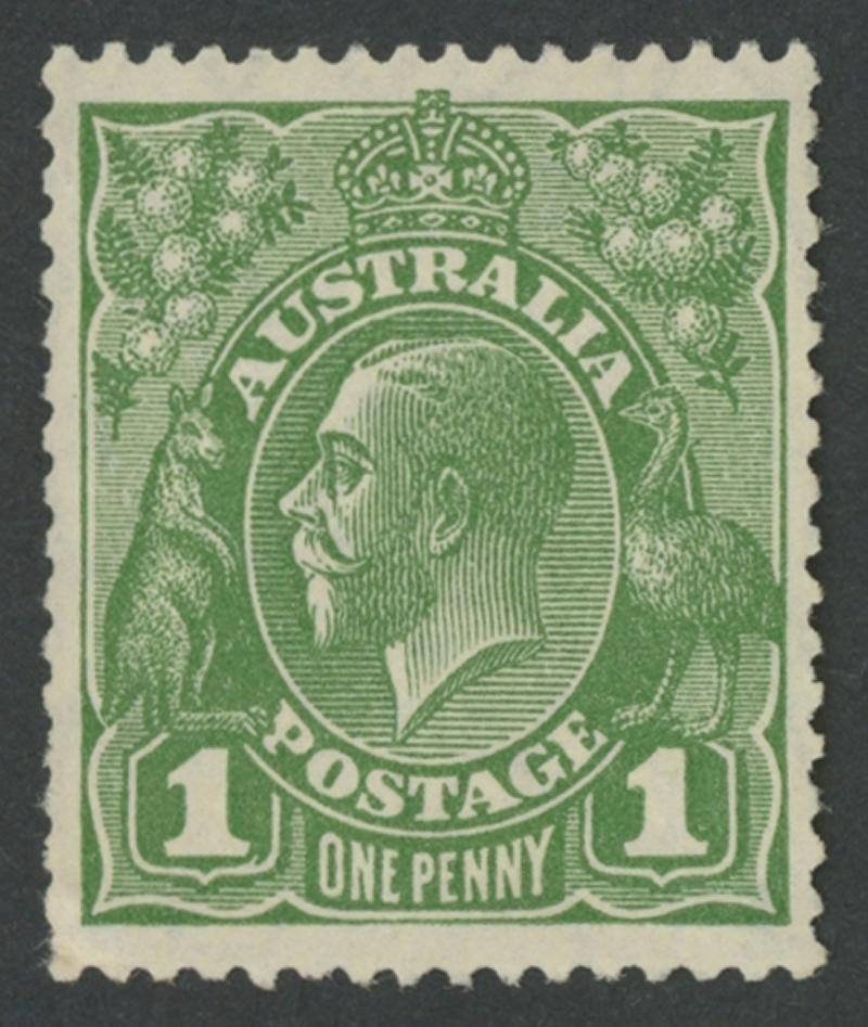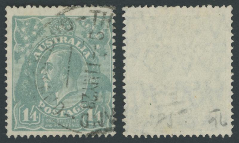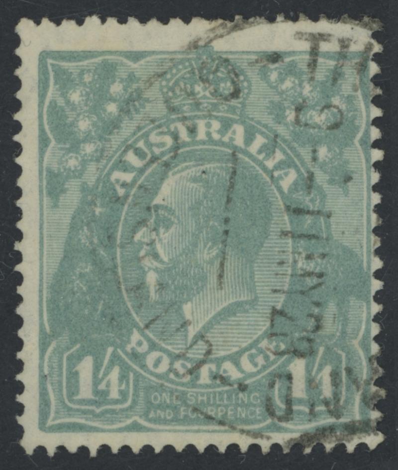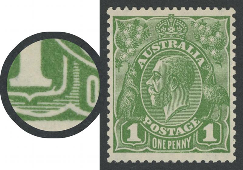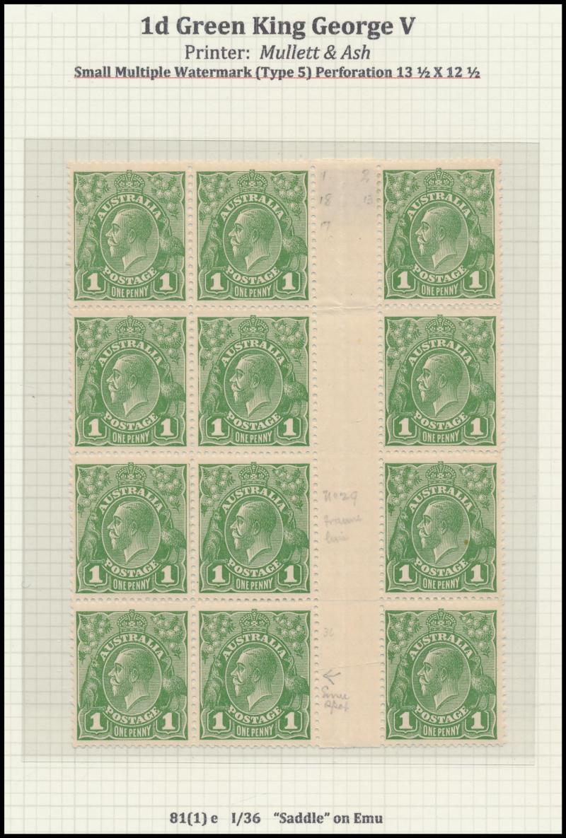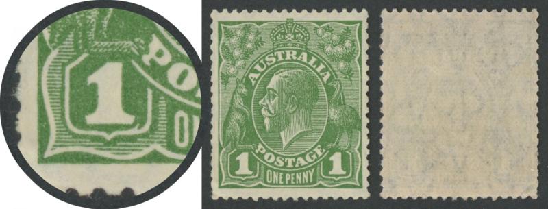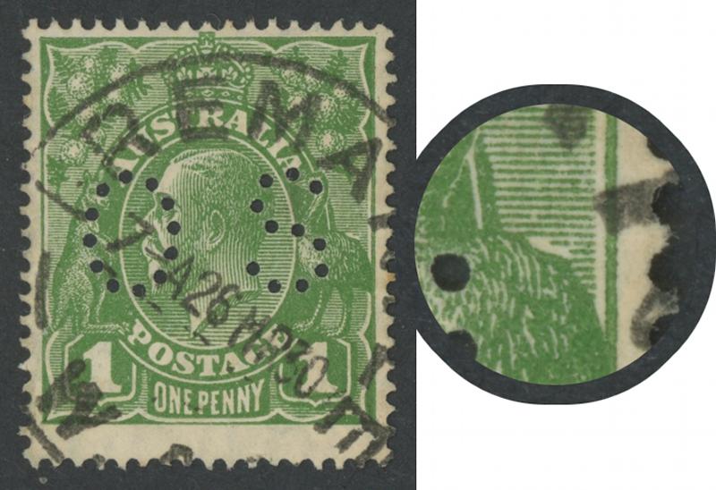 1d green with Saddle on Emu ACSC 80ba(1)e, Fremantle (WA) 1930 cds cancel clear of the variety, Cat $2000+ for unpunctured. A rare