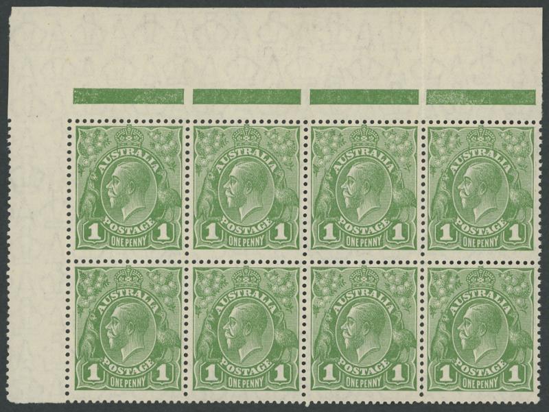 1d green Plate 1 Die I / Die II / Die II / Die I marginal block of 8 (4x2) from the upper-left corner of the right-hand pane [Pos