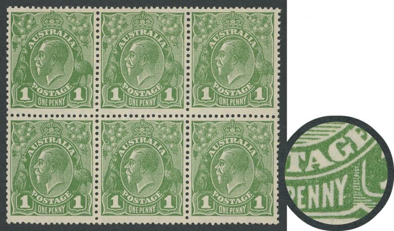 IV/34 & 35], the lower-left unit with Thin 'G' of 'POSTAGE' Retouch Re-Entered [Pos IV/40] and the lower-central unit with Small Dot on 'Y' of 'PENNY' (Pregnant 'Y') [Pos IV/41] ACSC 81(2)jb, kb, la & m, small hinge remainders, Cat $450+ for the