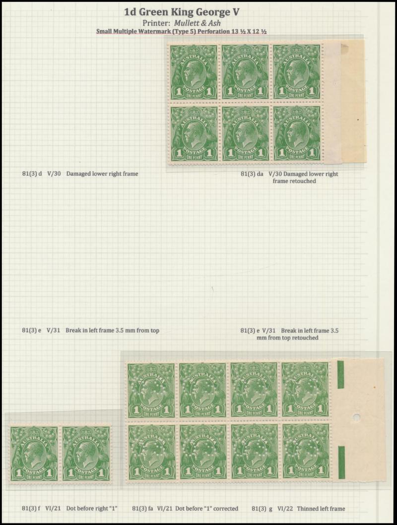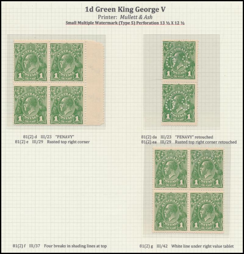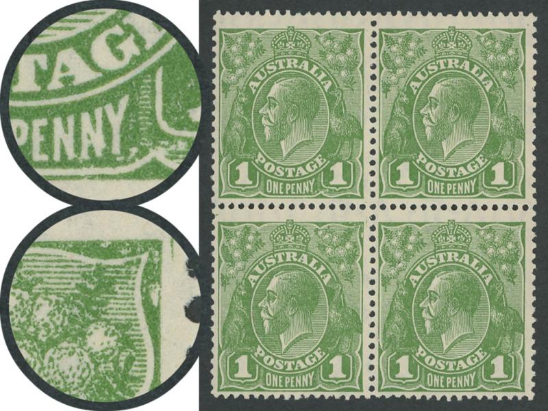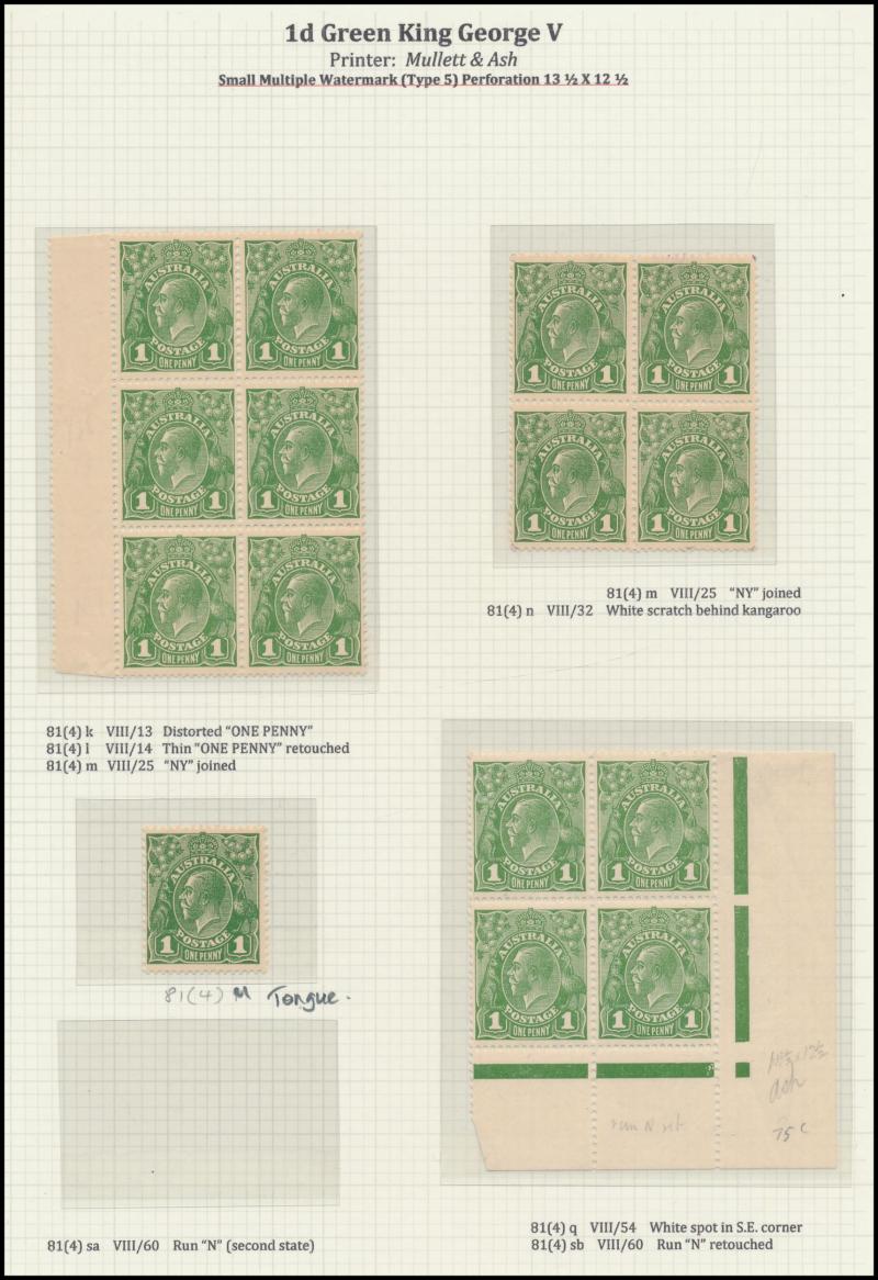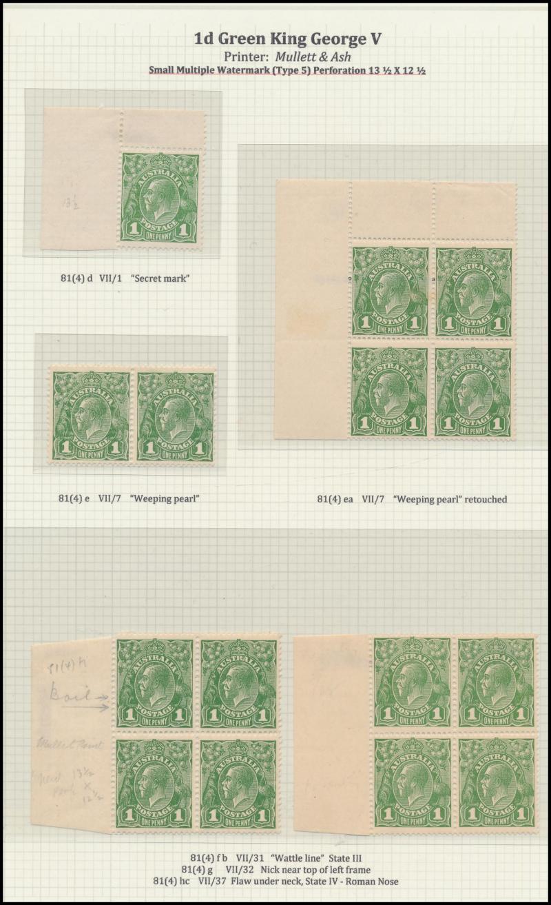 unretouched), Neck Flaw [Pos VII/37] in a block of 4 * (scarce unretouched) and Retouched & Wattle Line Retouched [Pos VII/31/37] in a block of 4 *, Kangaroo's Tongue Out [Pos VII/1] single * (scarce unretouched), also AJ Mullett Imprint blocks */**