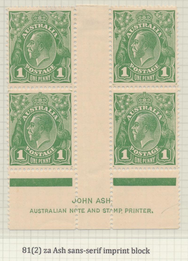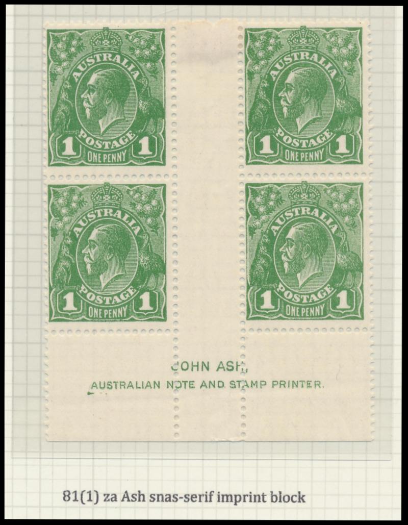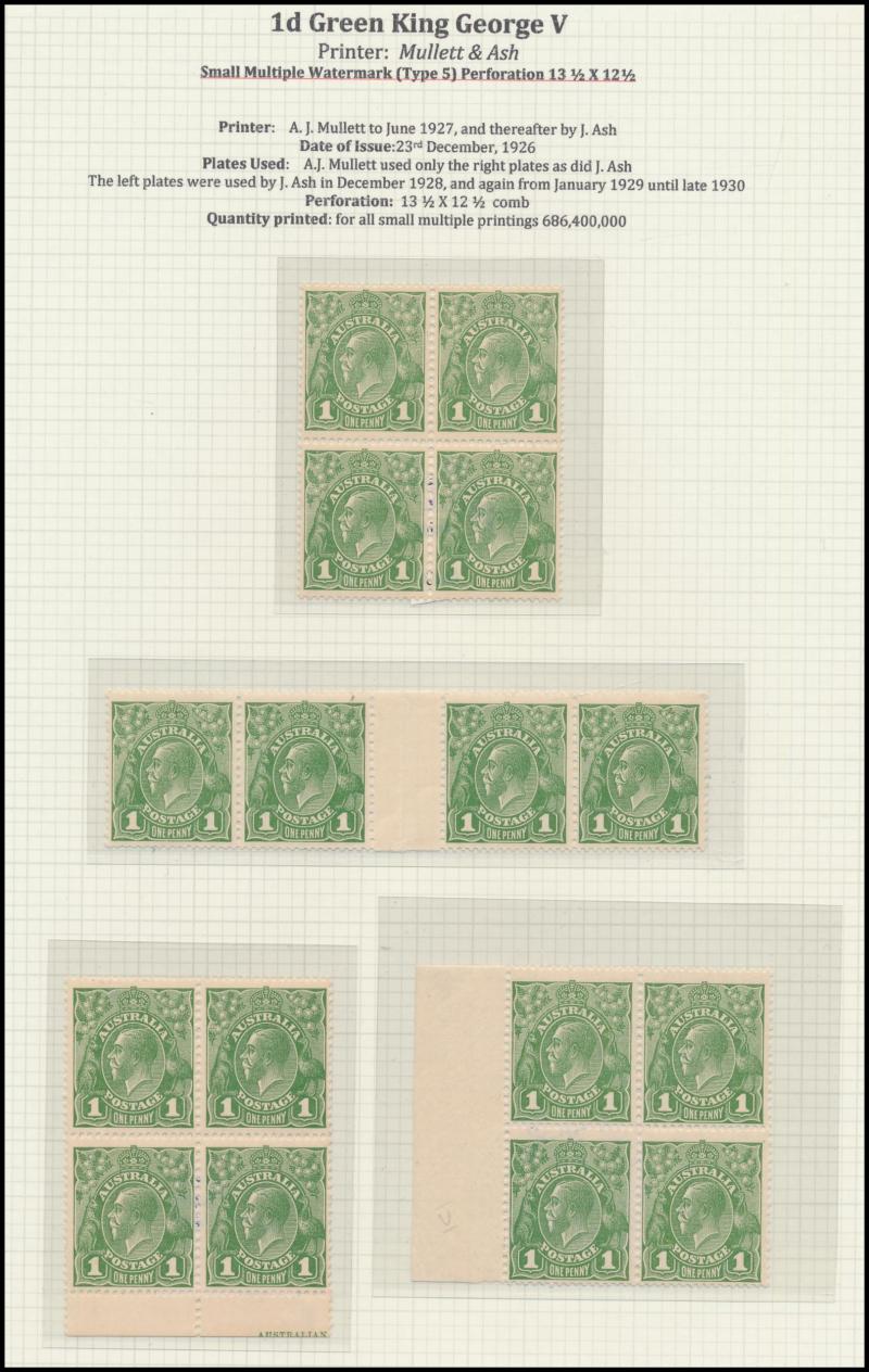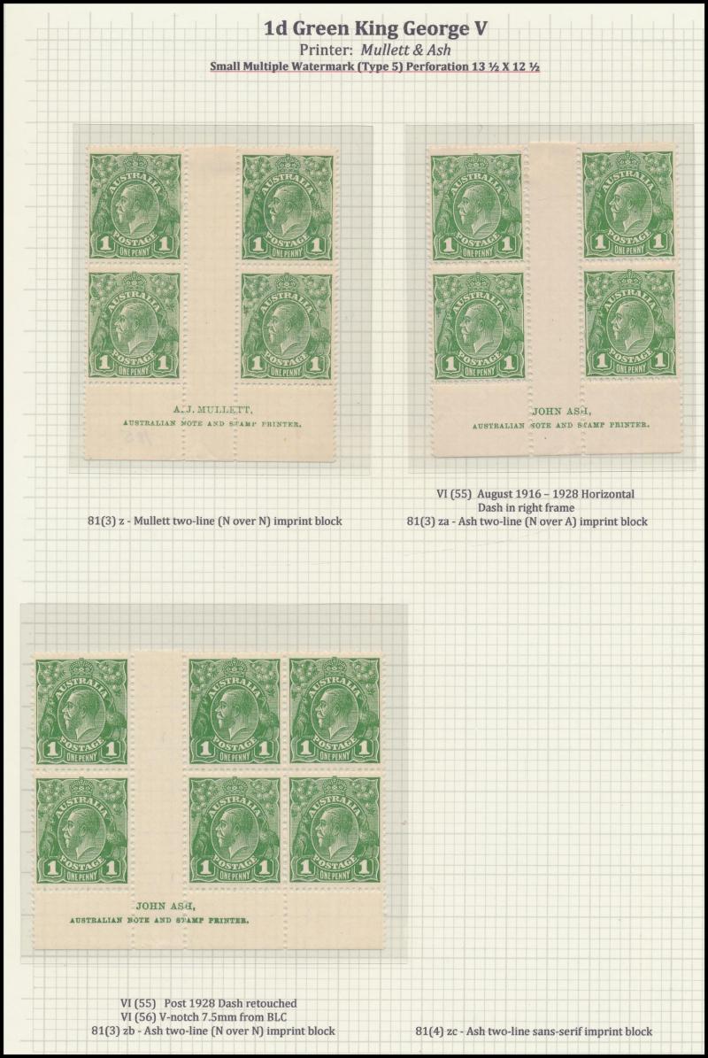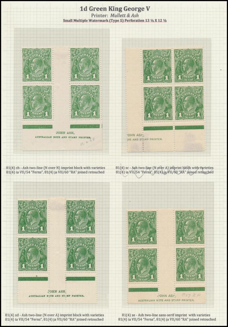 unretouched), Neck Flaw [Pos VII/37] in a block of 4 * (scarce unretouched) and Retouched & Wattle Line Retouched [Pos VII/31/37] in a block of 4 *, Kangaroo's Tongue Out [Pos VII/1] single * (scarce unretouched), also AJ Mullett Imprint blocks */**
