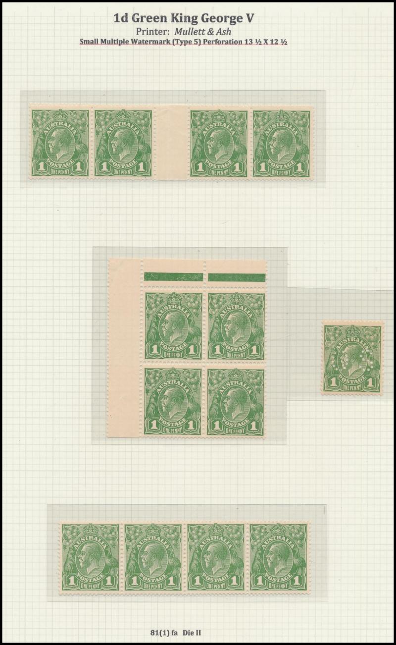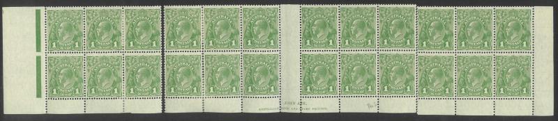1d green ACSC 81 (SG 95) mint varieties mostly in multiples including Die I / Die II pairs in a block of 4 ** and a Die II