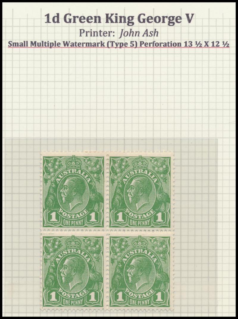 1d green Die II ACSC 81(1)i with the Watermark Inverted (SG 95bw) with characteristic trimmed perfs from coils at left,