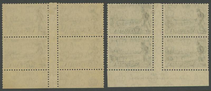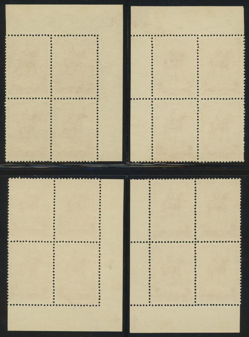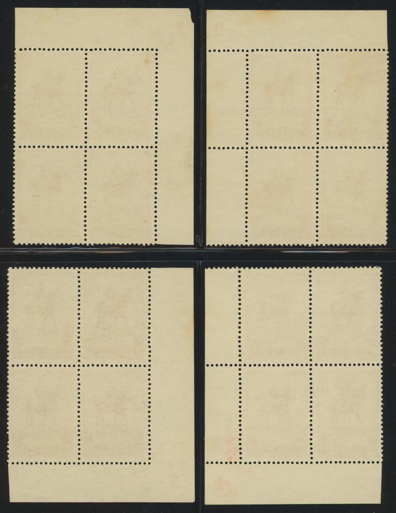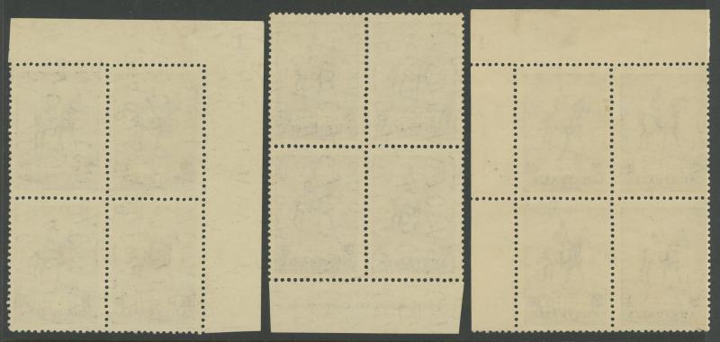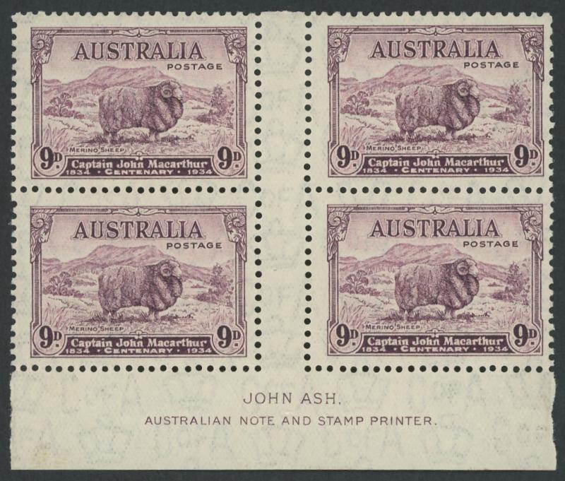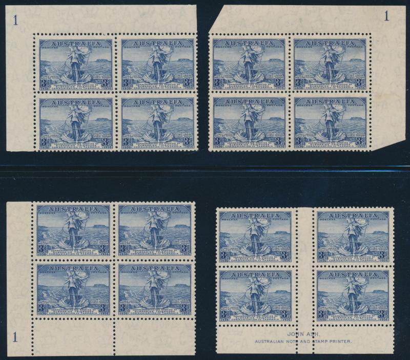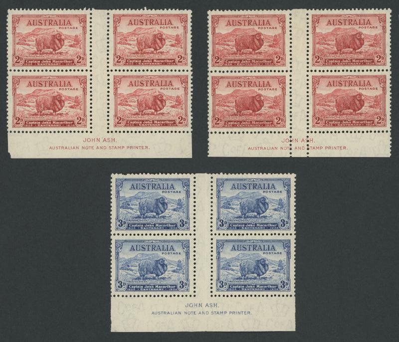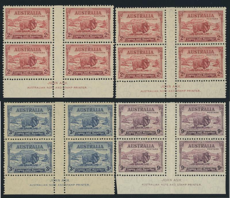 1934 Macarthur Centenary 2d red, 2d Dark Hills red, 3d blue & 9d purple SG 150-152 John Ash Imprint blocks of 4 ACSC 157-160z, the