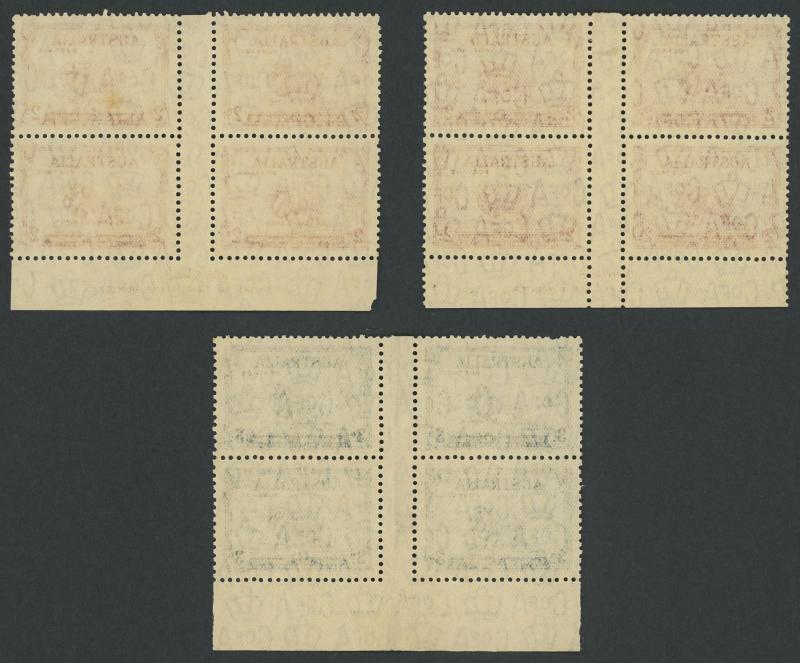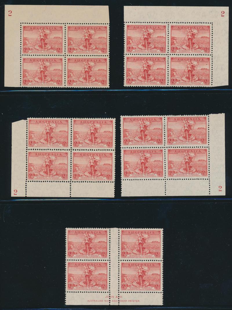 1934 Macarthur 2d to 9d SG 150-152 John Ash Imprint blocks of 4 ACSC 157z-160z plus 2d imprint block with Broken Left Leg of 'H' in