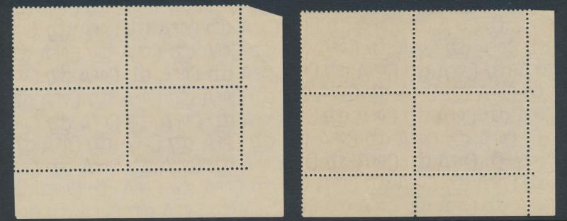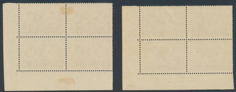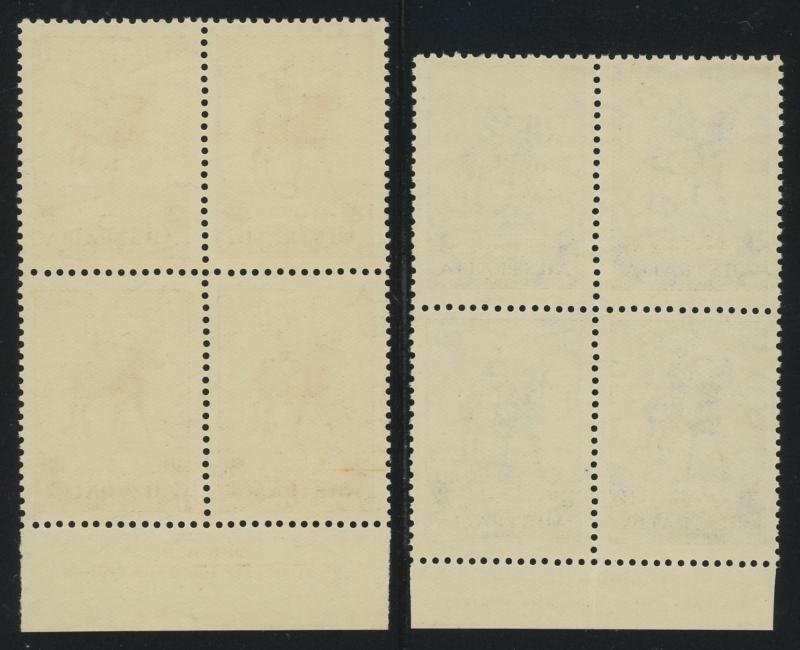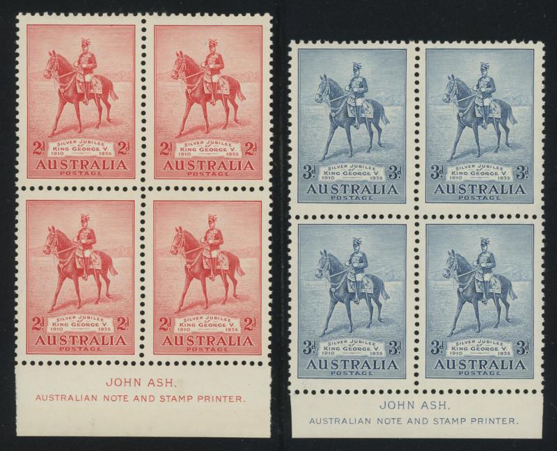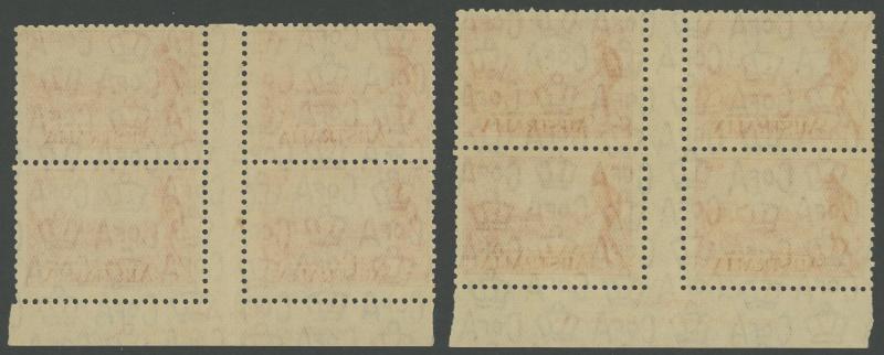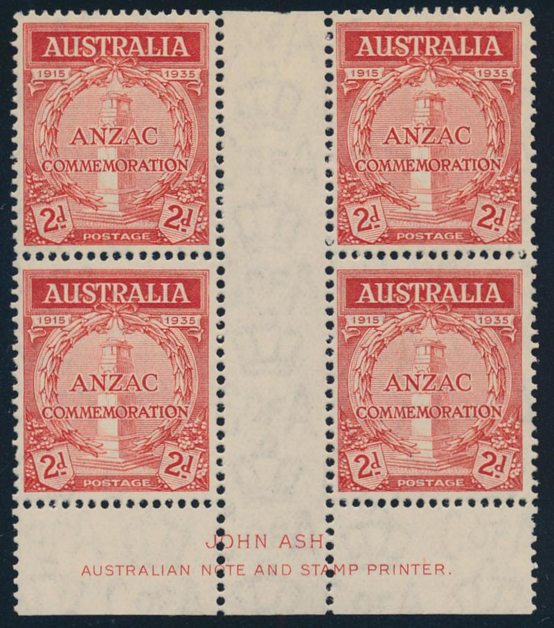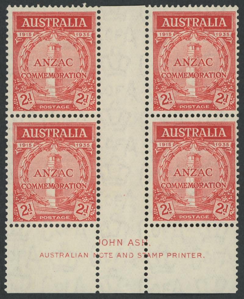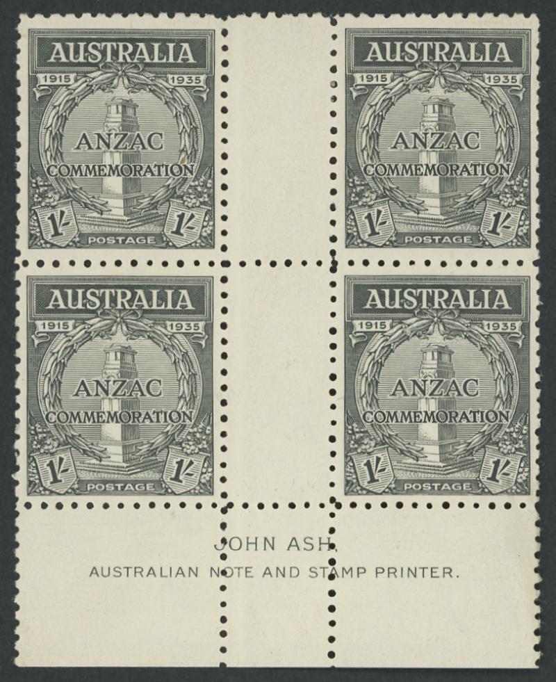 1935 ANZAC 2d red & 1/- black SG 154 & 155 John Ash Imprint blocks of 4 ACSC 164zl & 165zb, the upper units lightly mounted & lower