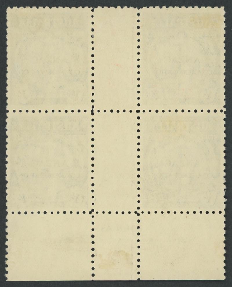 variety singles & six normal singles mounted). The variety was caused by foreign matter on the transfer roller, and affected five units on one sheet, all of which are present in the block. (Image1)