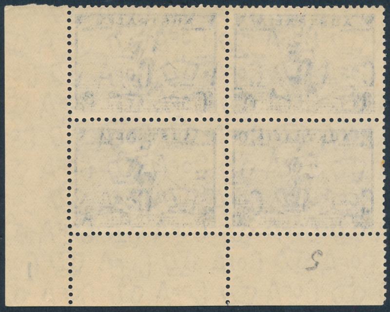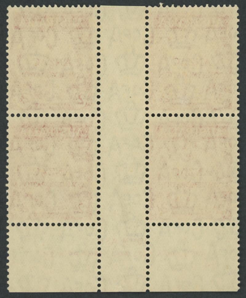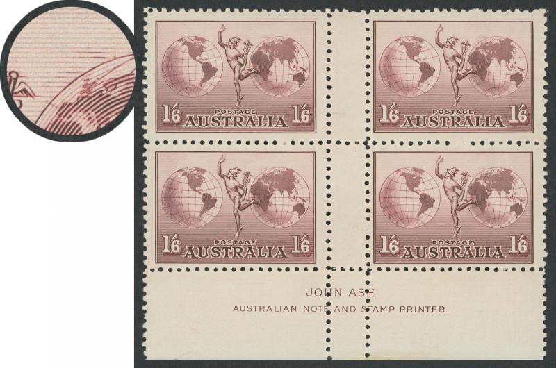 1934-49 Hermes Airmail 1/6d claret Perf 11 SG 153 John Ash Imprint block of 4 the upper-right unit with Retouched Shading Above