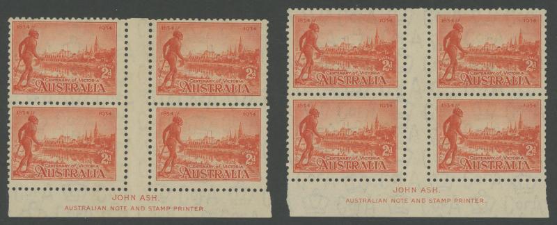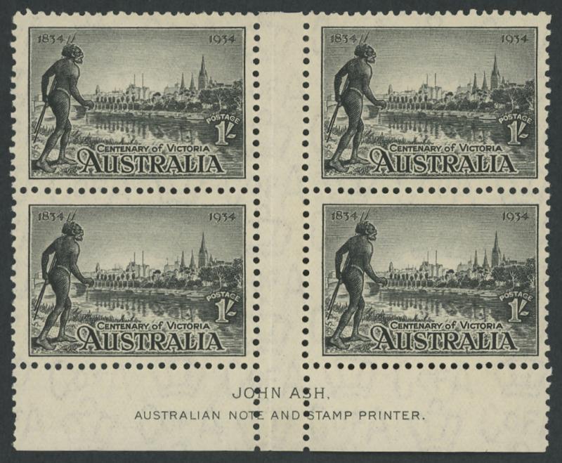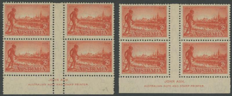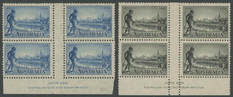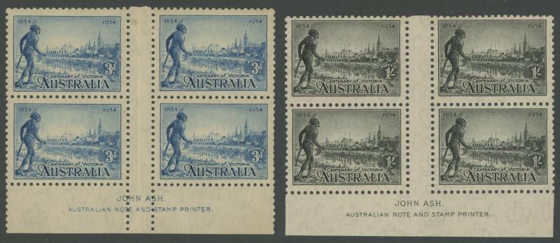1934 Victoria Centenary Perf 10½ & Perf 11½ sets SG 147-149 & 147a-149a John Ash Imprint blocks of 4 ACSC 151z-156z all except the