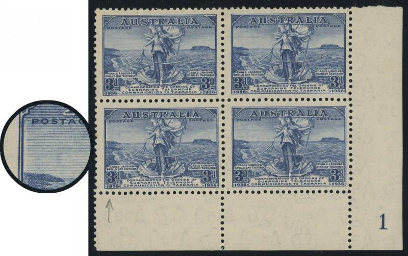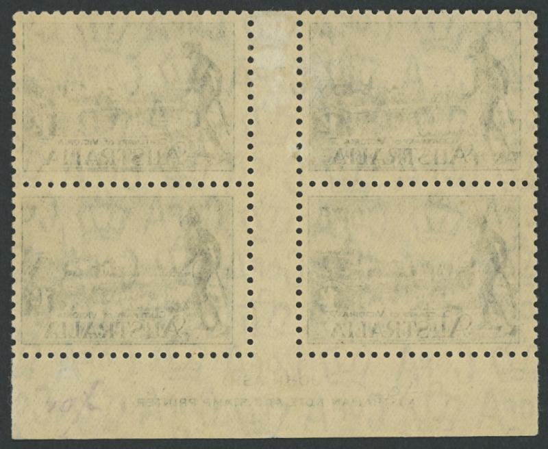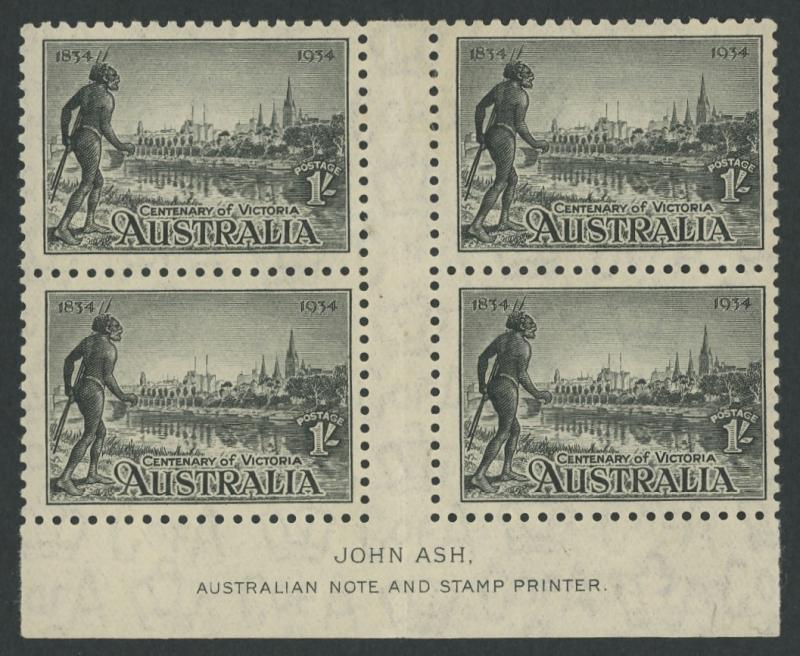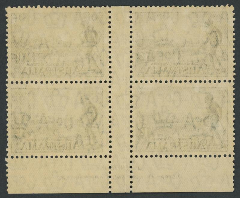 1934 Victoria Centenary 3d blue Perf 11½ SG 148a John Ash Imprint block of 4 the lower units both with Flag on Tower ACSC 155za in