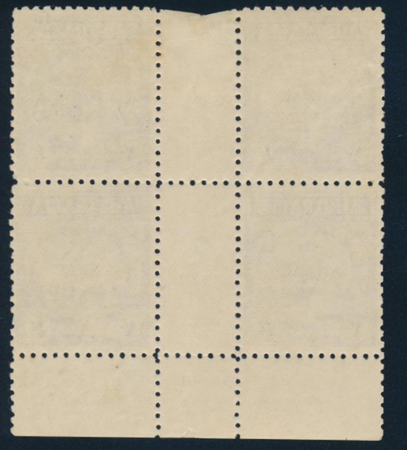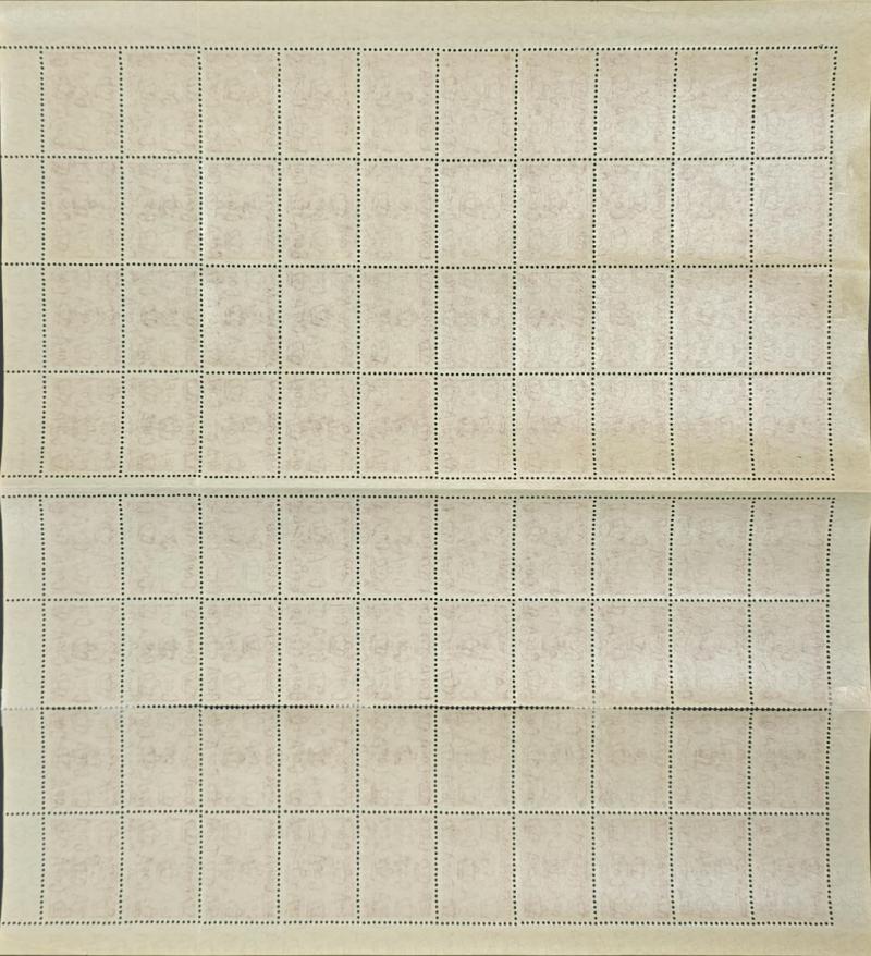 complete sheet with variety. The ACSC (footnote 6) mentions a missing imprint, but does not list any missing plate numbers. Ex Colonel Harrie Evans with his annotations. (Image1) (Image2)