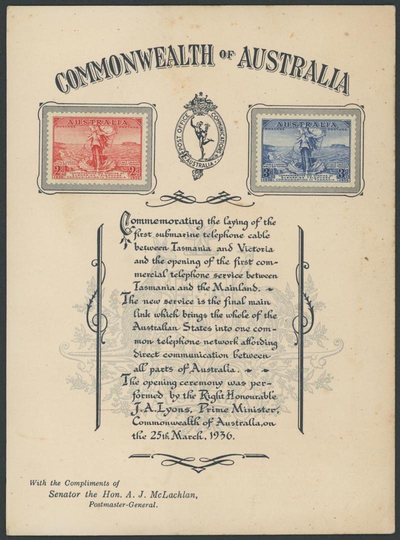1936 Submarine Cable 2d scarlet & 3d blue affixed to Postmaster-General's presentation card ACSC 170ya, small bends in the
