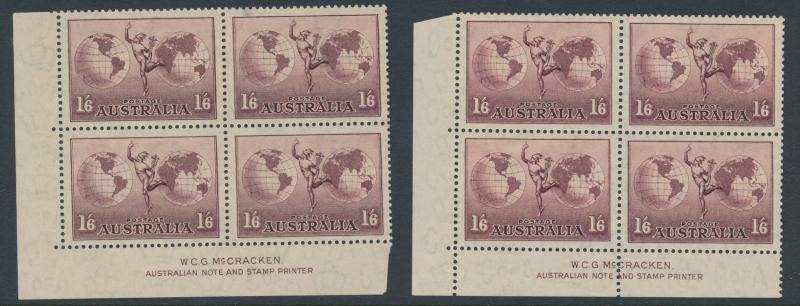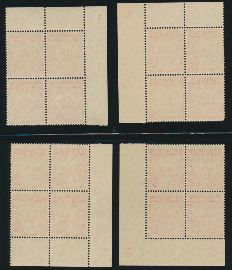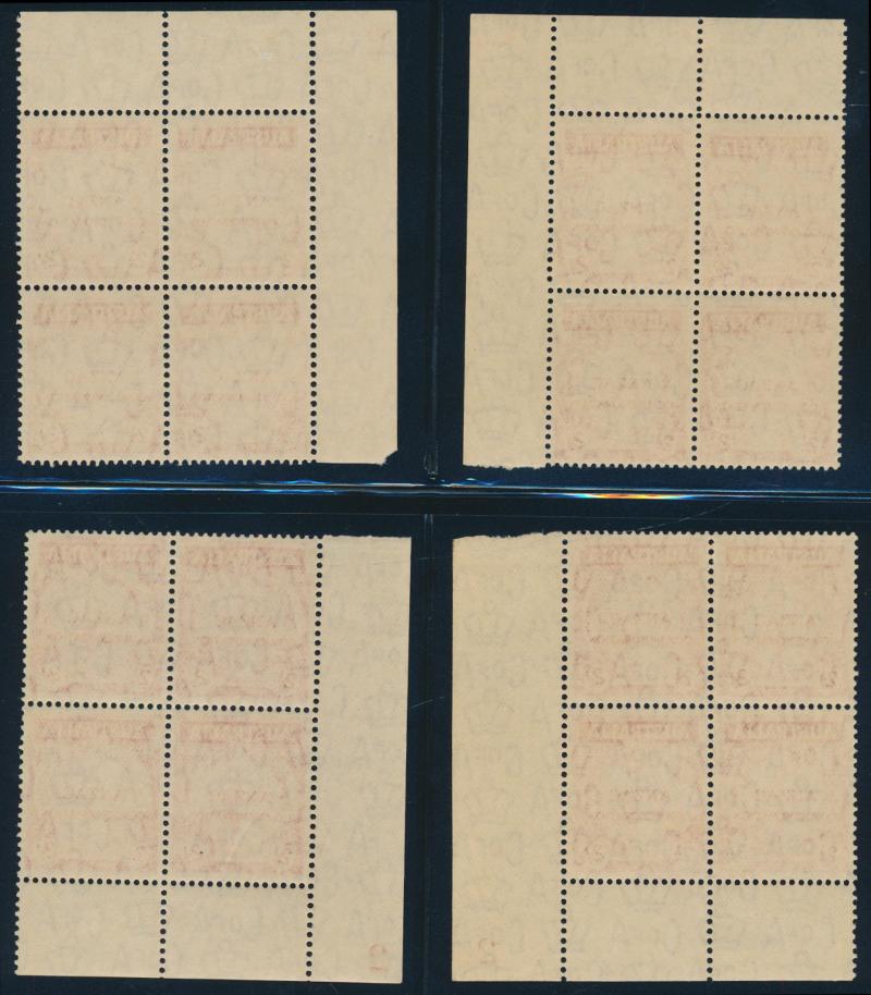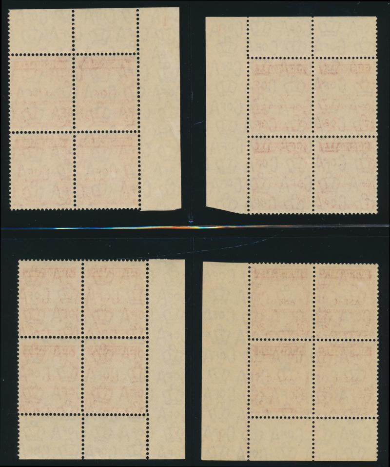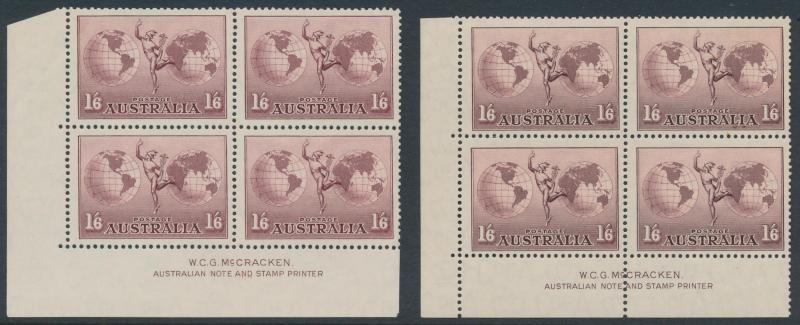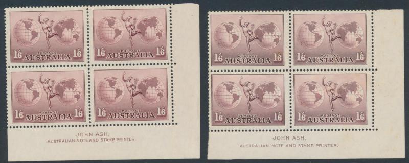 Left Side of Right Globe ACSC 161za, the variety unit very lightly mounted, the others unmounted, also Perf 13½x14 John Ash Imprint blocks of 4 with 42½mm and with 38mm imprints ACSC 162za & ze, the former unmounted with a couple of tiny aging marks