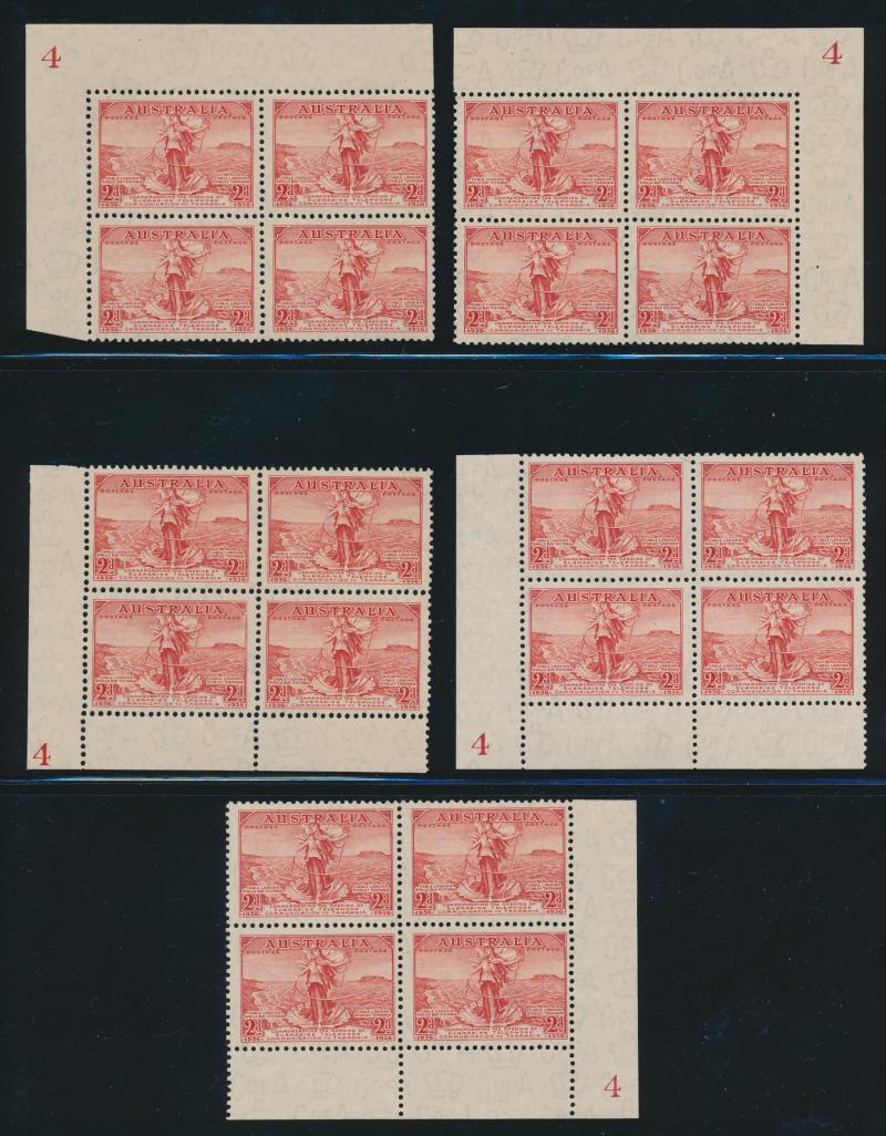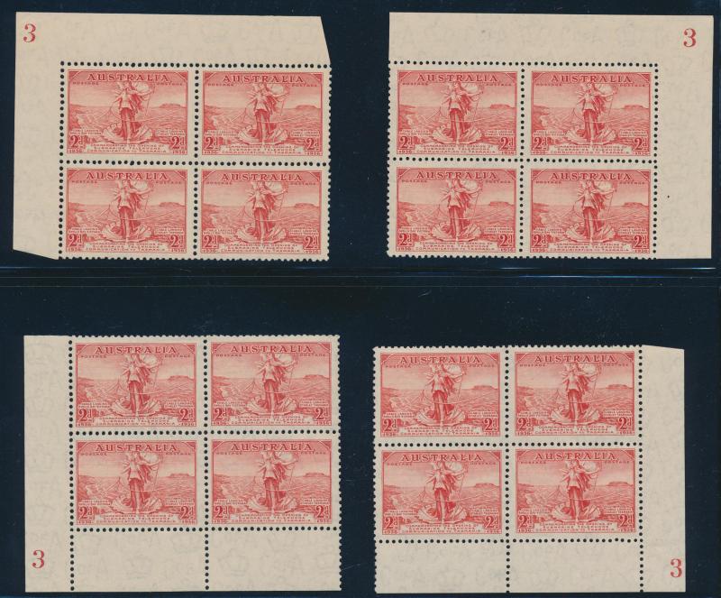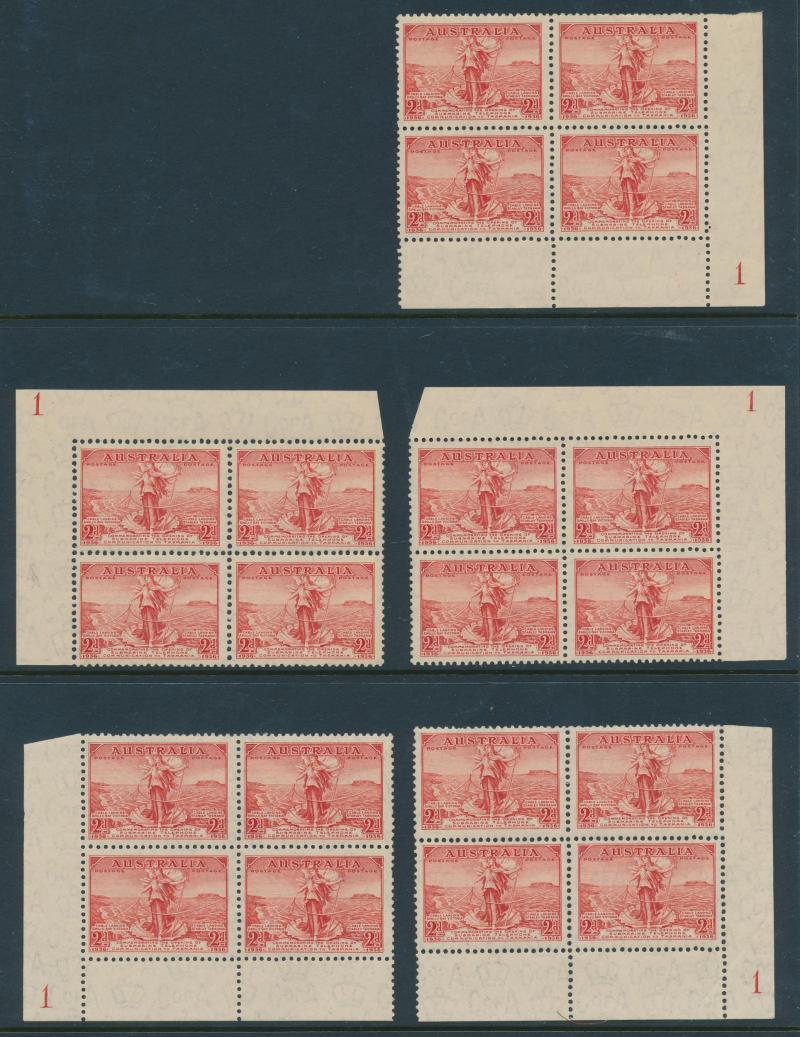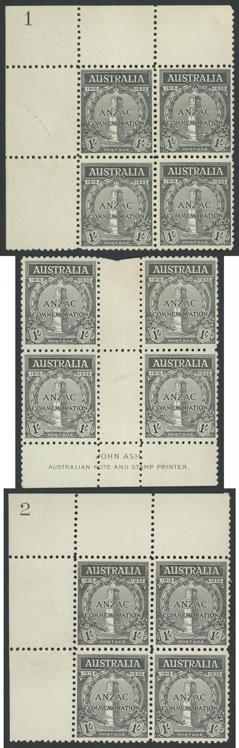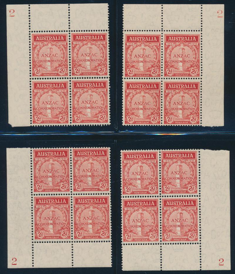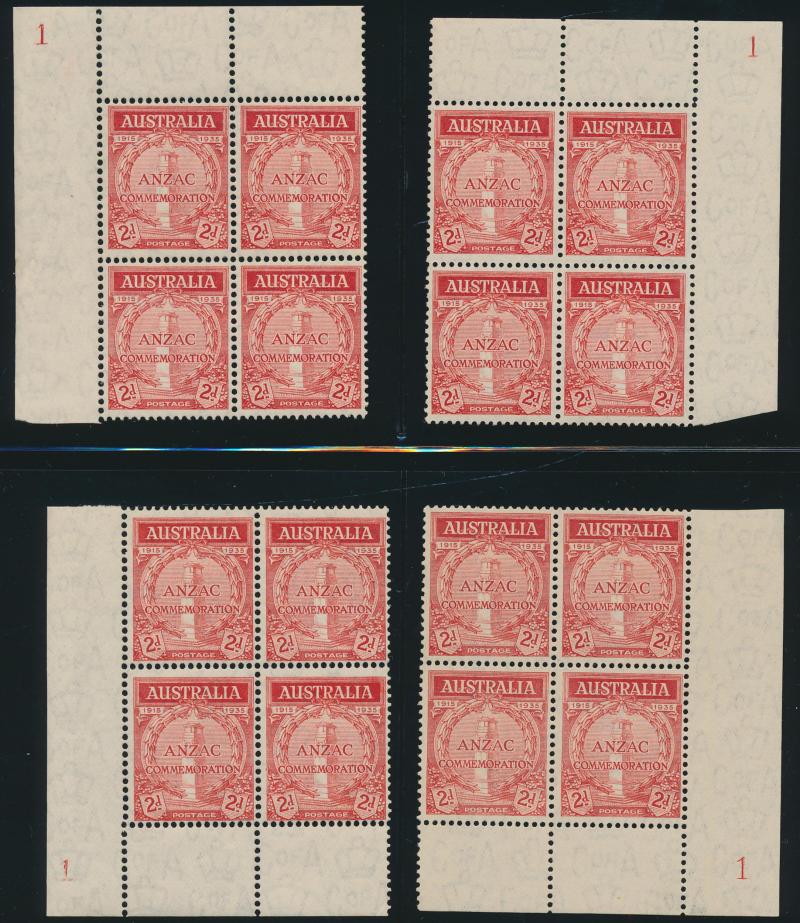 1935 ANZAC 2d red SG 154 Plate Numbers '1' '2' & '3' complete set of blocks of 4 from all four corners of the sheets plus John Ash