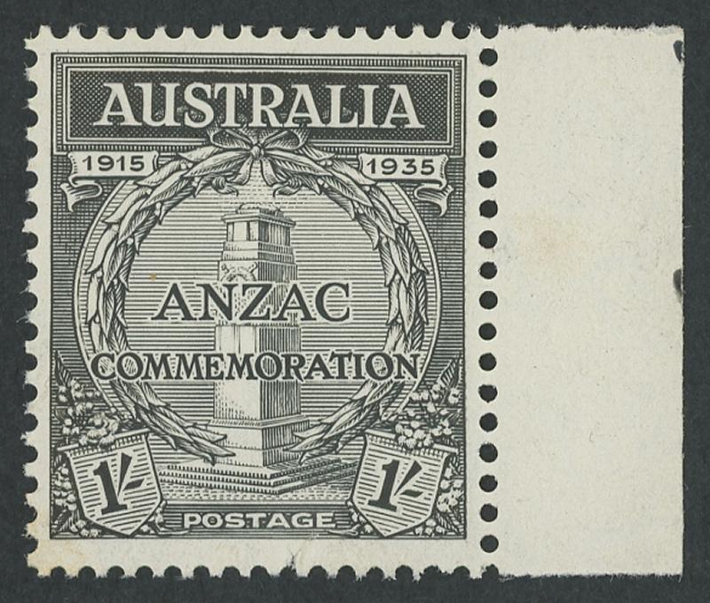 1935 ANZAC 1/- black Perf 13½x12½ on Thinner Paper ACSC 165PP(1) marginal single from the right of the sheet, small closed tear