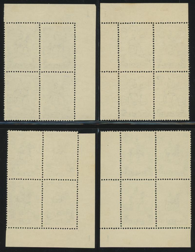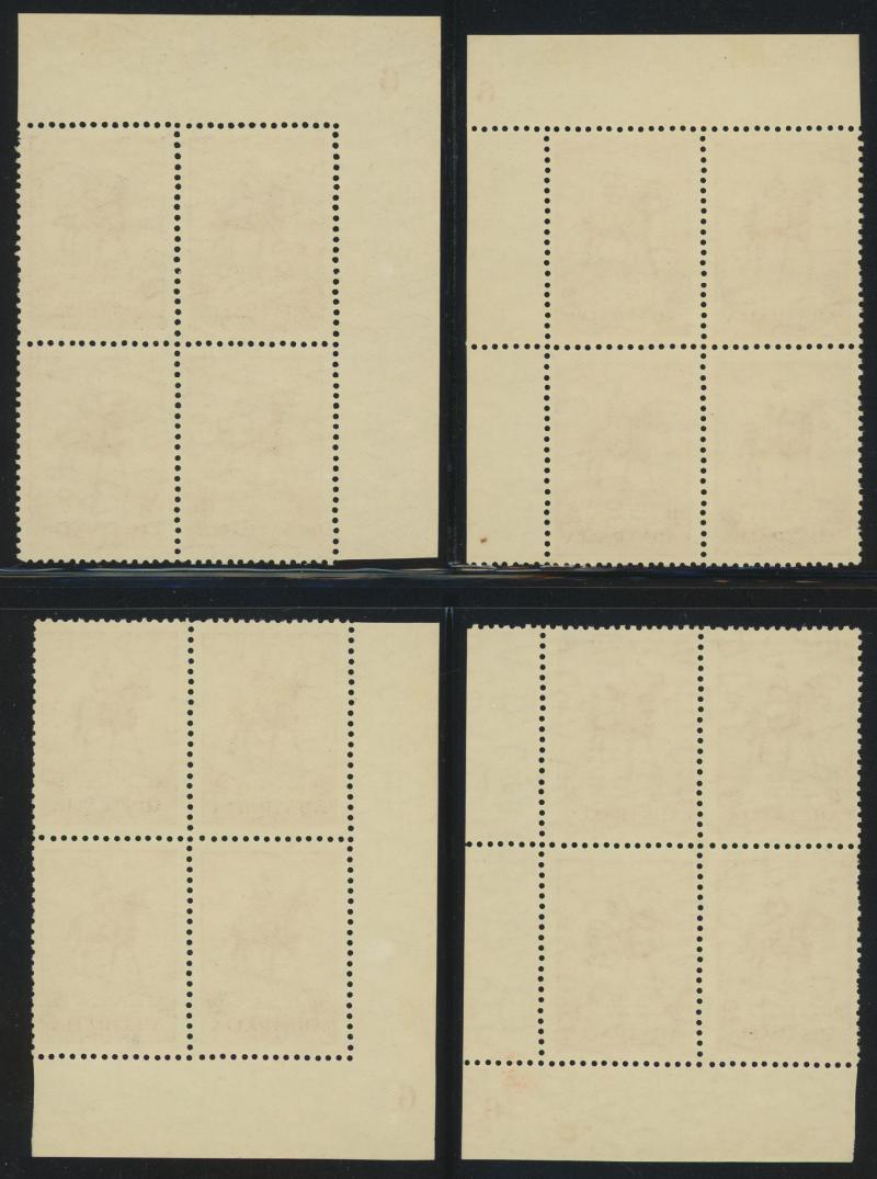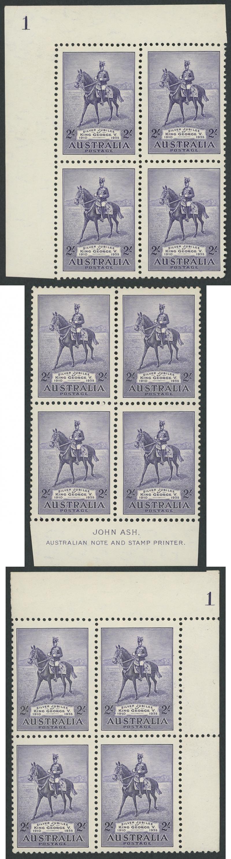 167z-zd, and 2/- violet SG 158 Plate Number '1' blocks of 4 from the two upper corners of the sheet (the upper-right with one unit lightly mounted) and John Ash Imprint block of 4 ACSC 168z-zb, a few with very minor blemishes but generally very fine,