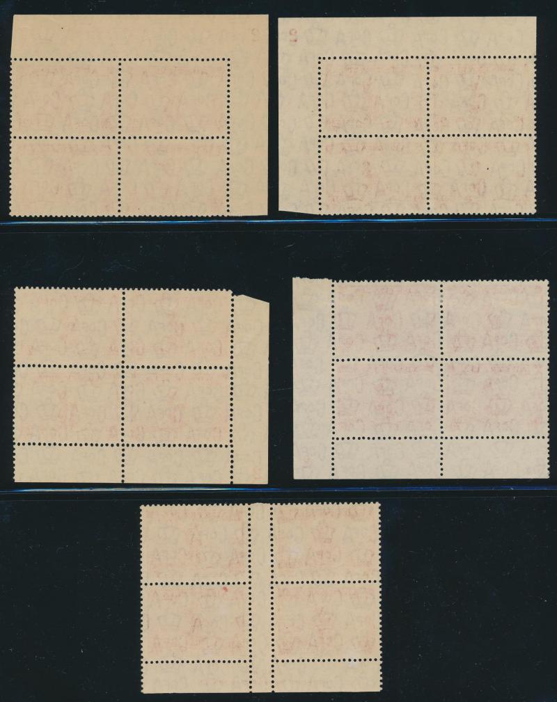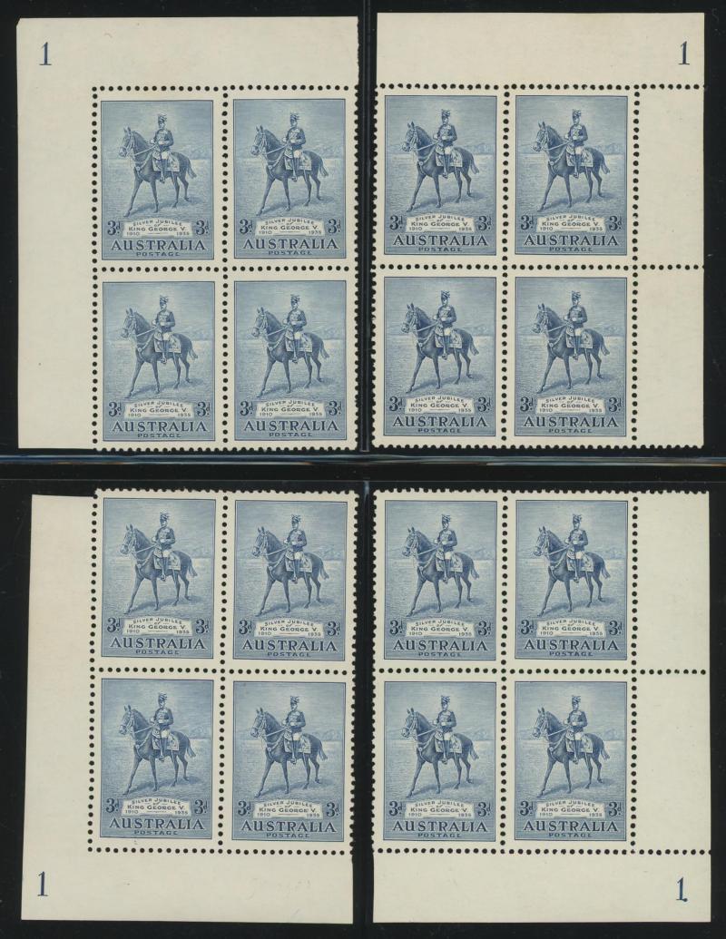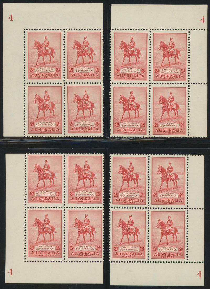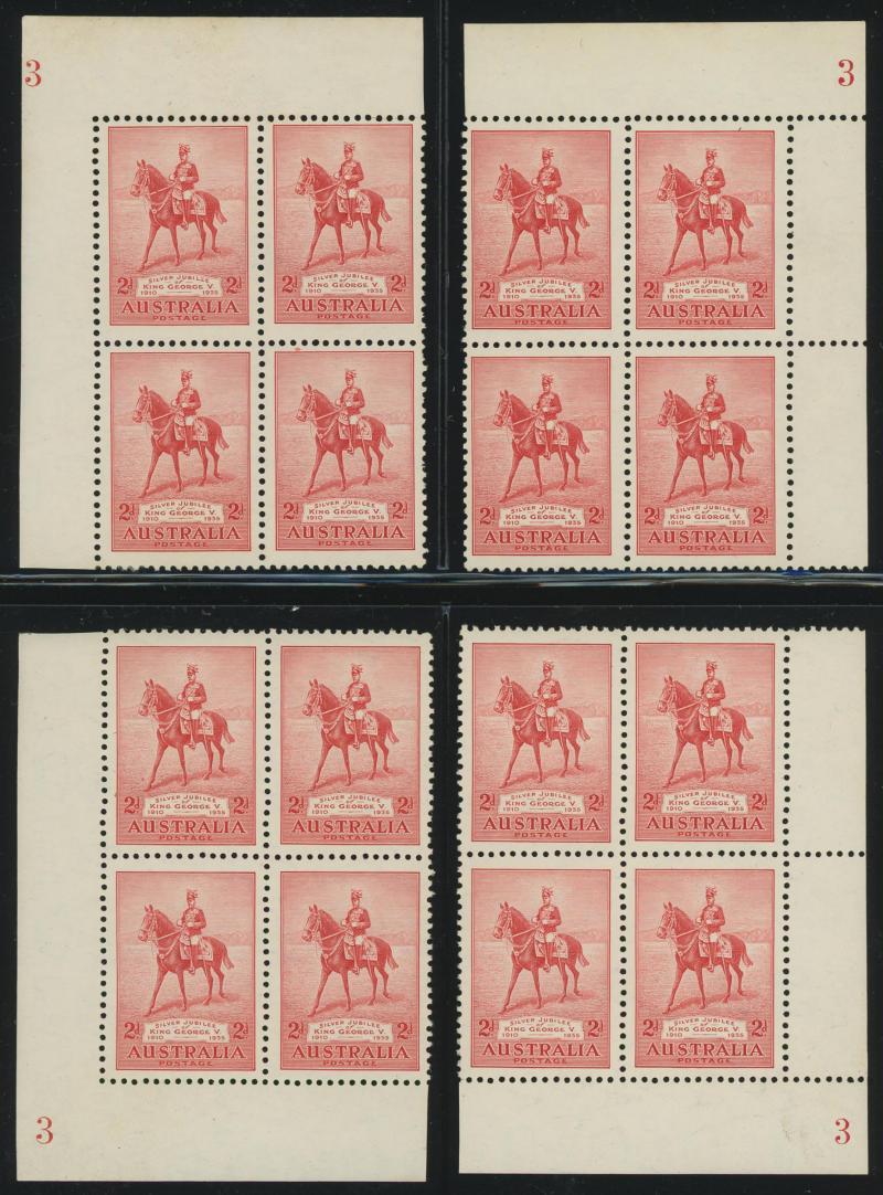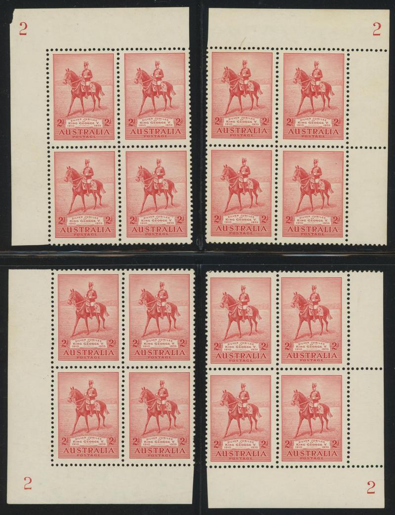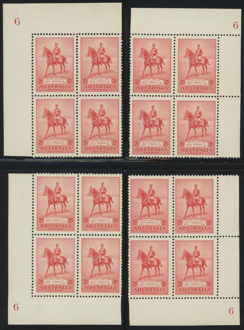 1935 Silver Jubilee 2d red SG 156 Plate Numbers '1' - '6' complete set of blocks of 4 from all four corners of the sheets ACSC