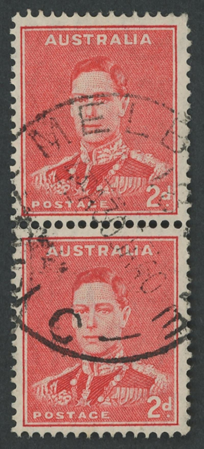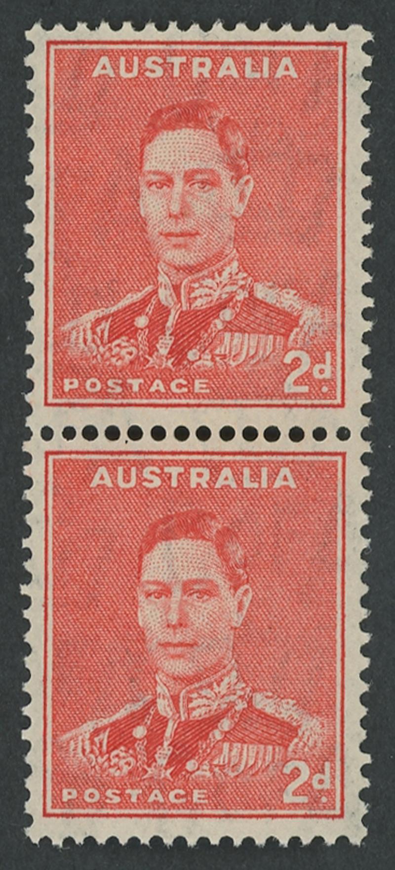 1937-49 Definitives Perf 15x14 KGVI 2d scarlet Die II Coil Perforation (Large & Small Holes) Vertical Pair ACSC 188bl (SG 184a),