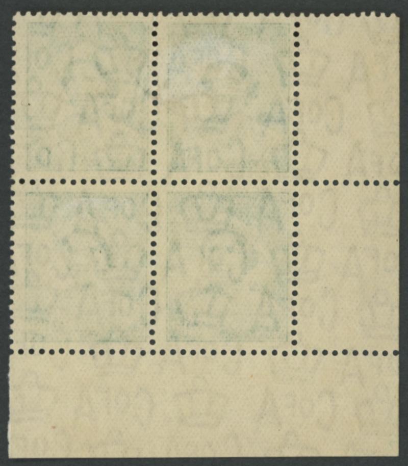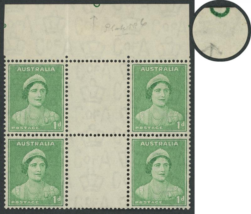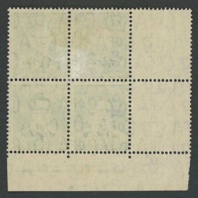 1937-49 Definitives Perf 15x14 QM 1d green Die II SG 180 interpanneau block of 4 (2x2) from the top of the sheet with partial Plate