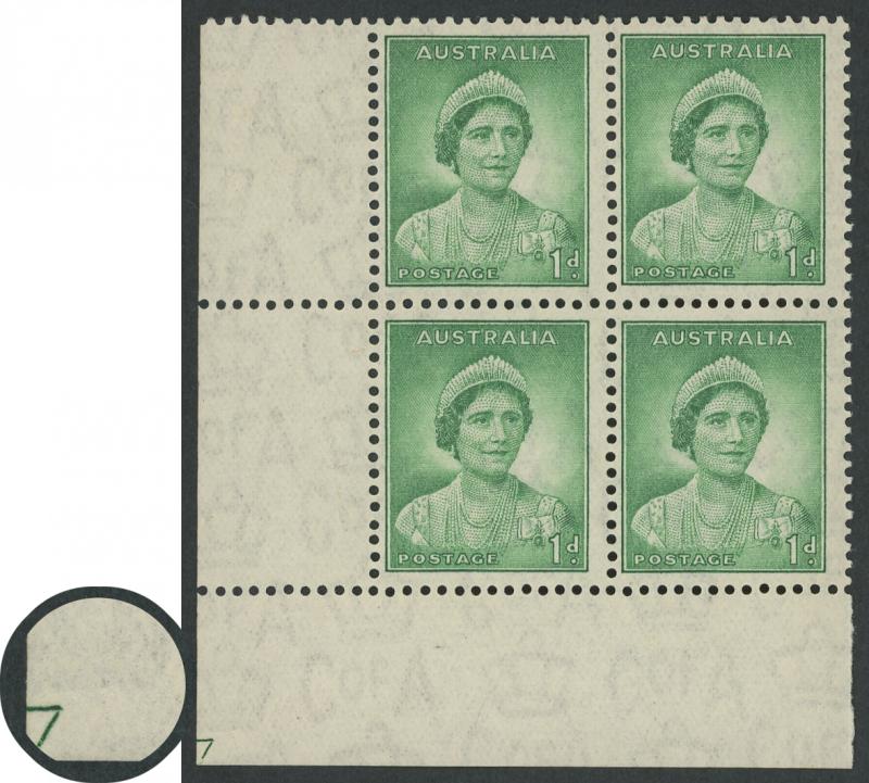 1937-49 Definitives Perf 13½x14 QE 1d green Die I SG 165 lower-left corner block of 4 with complete Plate Number ' 7 ' ACSC 181zt,