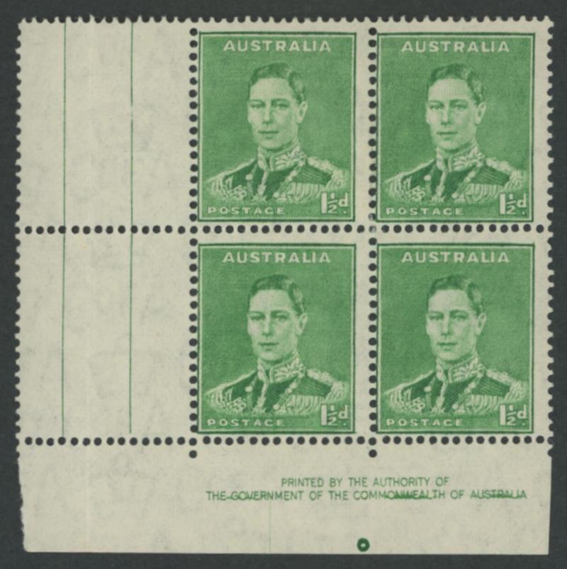 1938-49 Definitives Perf 15x14 KGVI 1½d green SG 183 By Authority Imprint block of 4 from the lower left of the right hand pane