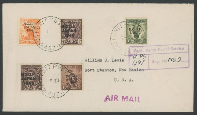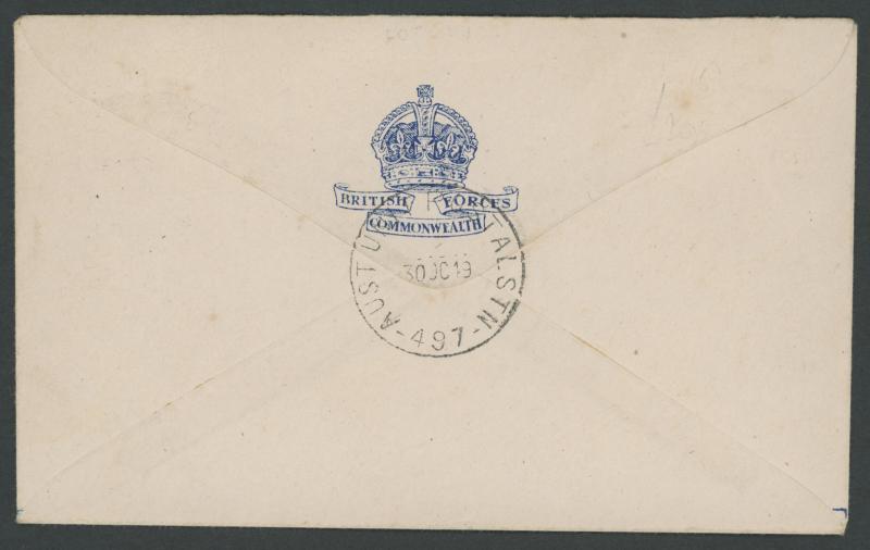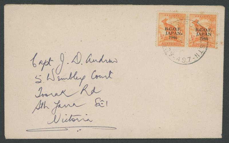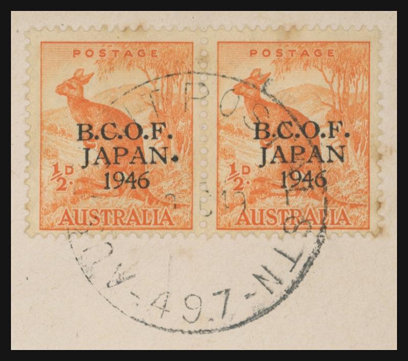 after 'JAPAN' ACSC J1L (SG J1c), tied by 'AUST UNIT POSTAL STN/497' cds in use at Kure, very minor tonespots, Cat $375 (£325) for the used variety, plus a significant premium for being in a se-tenant pair & for being on cover. (Image1) (Image2)