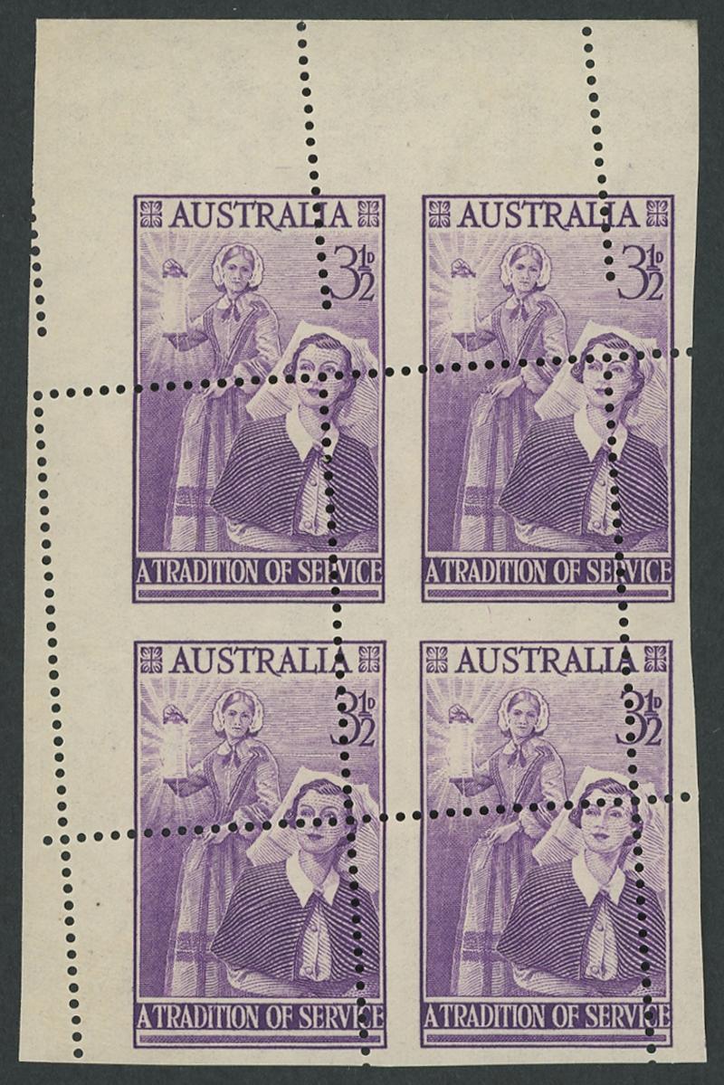 1955 Nursing 3½d violet SG 287 marginal block of 4 from the upper-left corner of the sheet with Grossly Misplaced Perforations ACSC