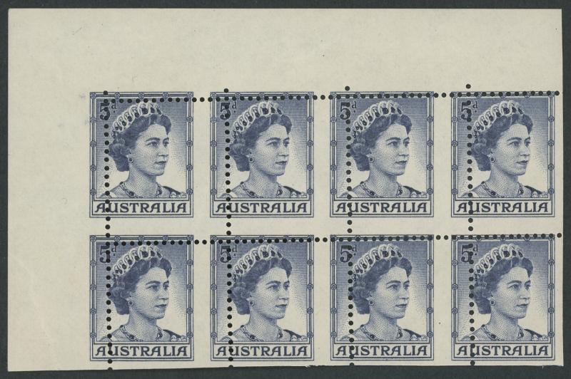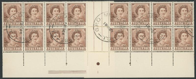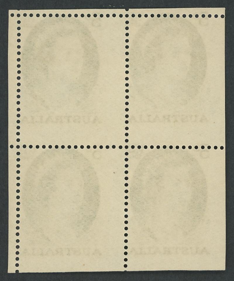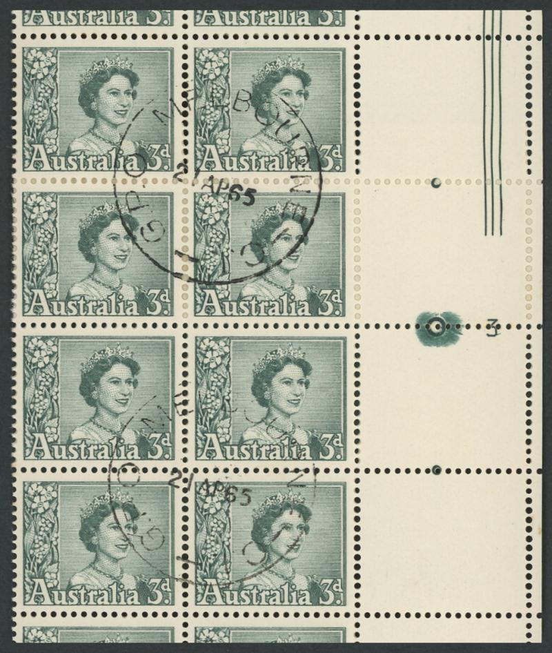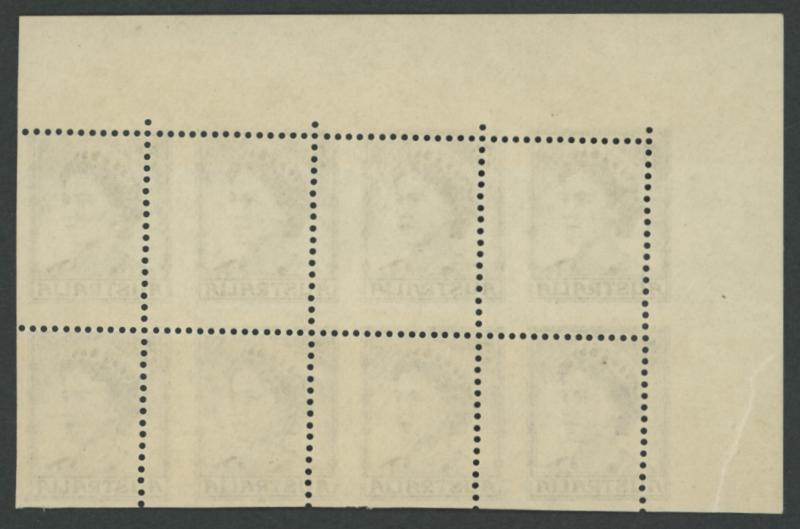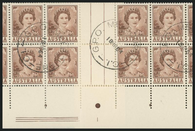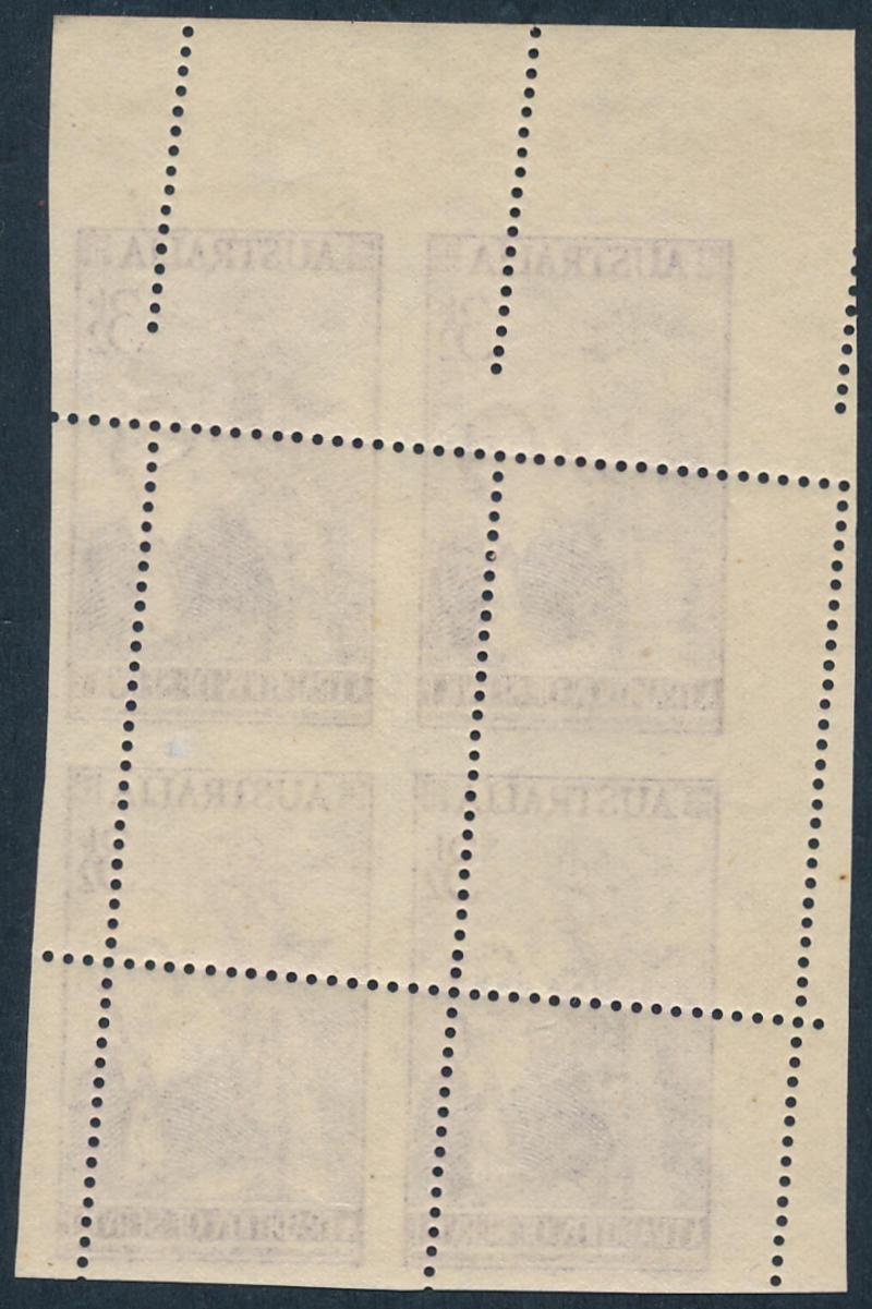 complete Plate Number ' 1 ' and Three Horizontal Lines to the Left ACSC 348za, CTO with GPO Melbourne cds cancels, full unmounted gum, Cat $1500+ for an unmounted block of 8 (unpriced used/CTO). Ex David Adams. (Image1) (Image2)