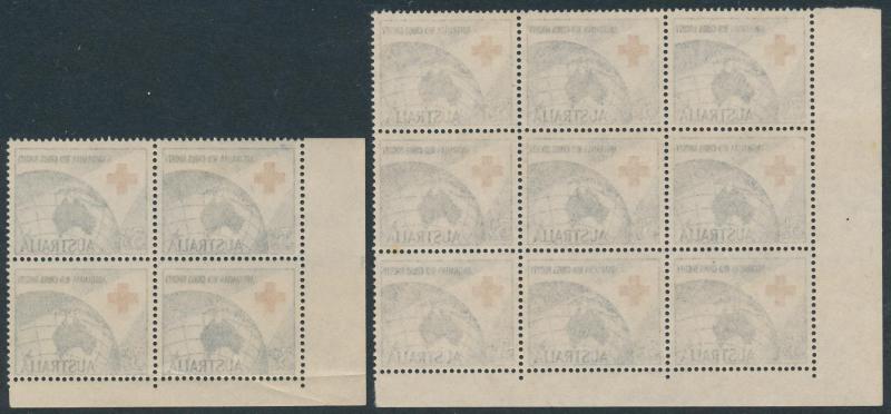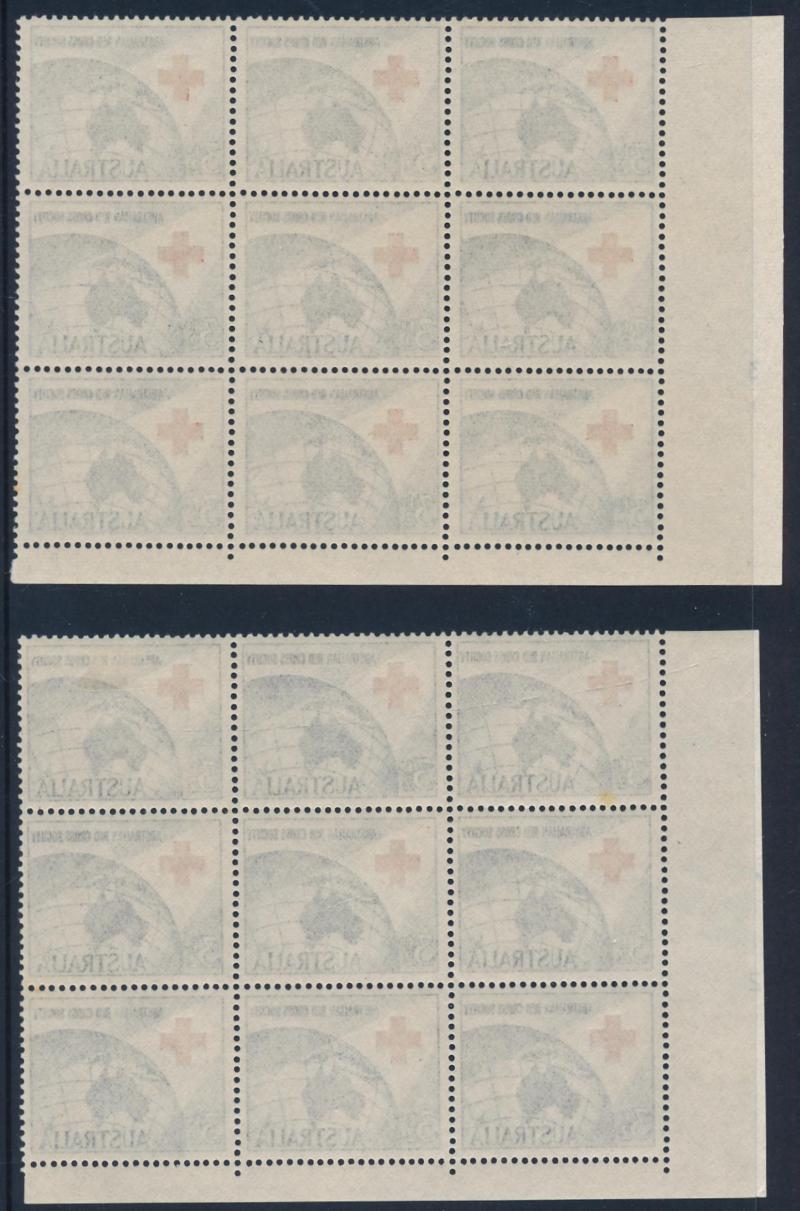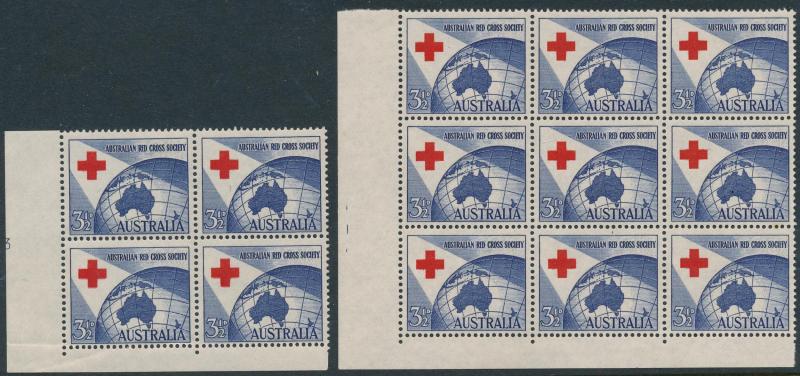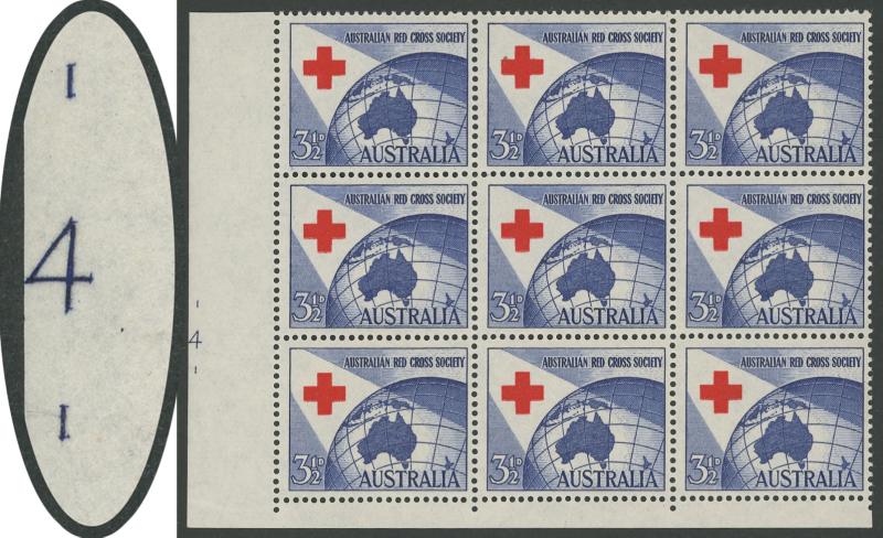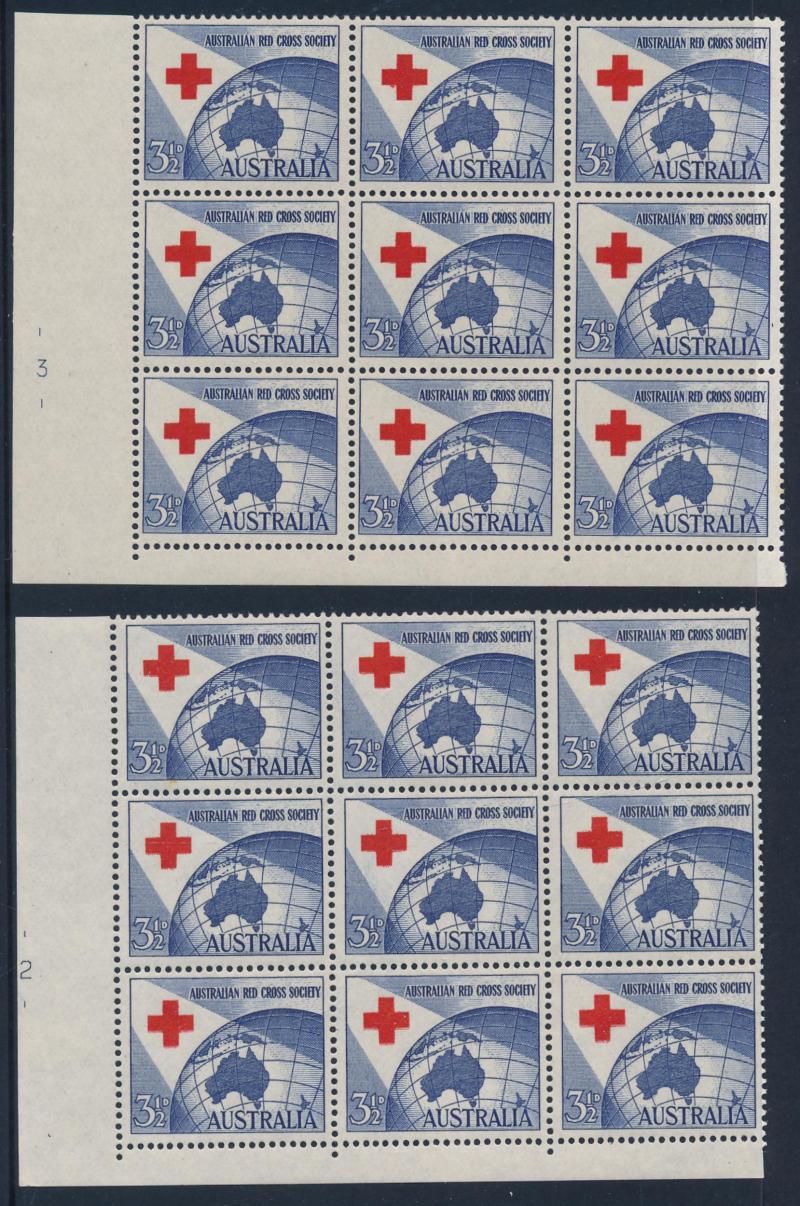 1954 Red Cross 3½d blue & red SG 276 blocks of 9 from the lower-left corners of the sheets with complete Plate Numbers ' - 1 -', '-