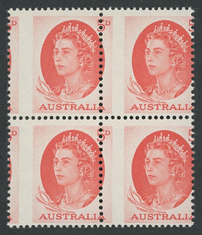 1963-65 QEII Definitives 5d red SG 347c Helecon Ink with Perforations Misplaced 3mm to Left ACSC 402bb block of 4 showing portions