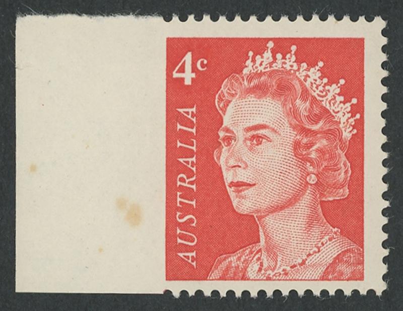 1966-73 Decimal Definitives QEII 4c red SG 385 marginal single from the left-hand side of the sheet Imperforate at Left ACSC 439bn,