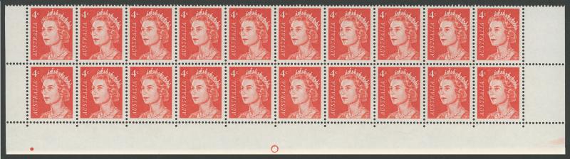 1966-73 Decimal Definitives QEII 4c red Helecon Paper ACSC 440 (SG 385 variant) marginal blocks of 20 with Plate Numbers comprising