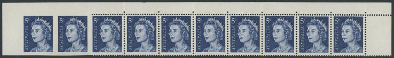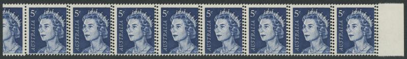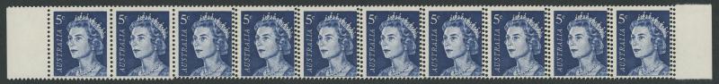 1966-73 Definitives QEII 5c dark blue SG 386c horizontal strip of 10 with margins at both sides, all except the two left-hand units