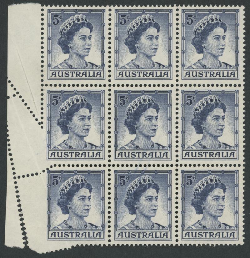 1959-63 QEII Definitives QEII 5d blue SG 314 marginal block of 9 (3x3) from the left-hand side of the sheet with Paper Fold &