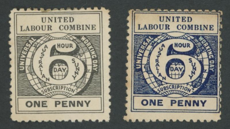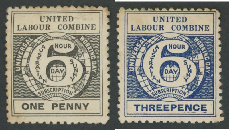 1930s (?) United Labour Combine perforated labels for the 6 Hour Day Campaign/Universal Working Day comprising 1d black x2 (one