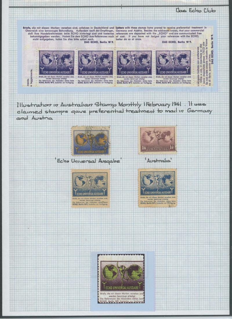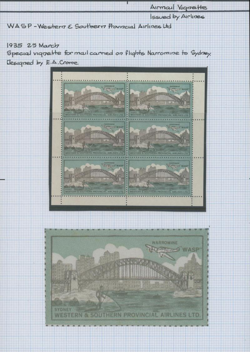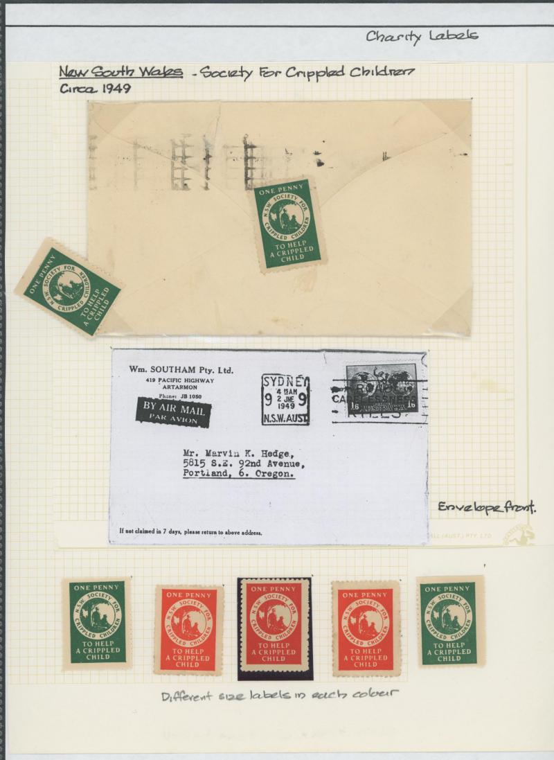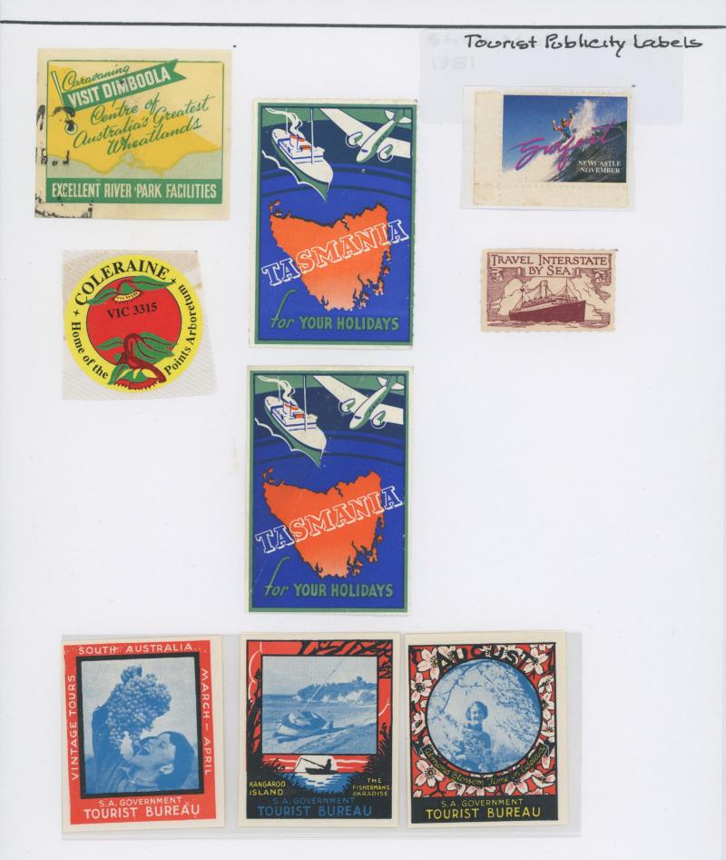 including usage on the reverse of commercial covers, airmail labels with some early issues including WASP sheetlet, also NSW Sanatorium 1/- (mint), SA Centenary 'Bradman' label (minor scuffs), 1947 Day Dream Island (unused), German 'Echon Universal