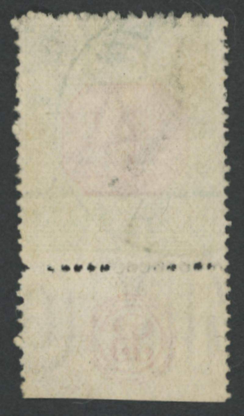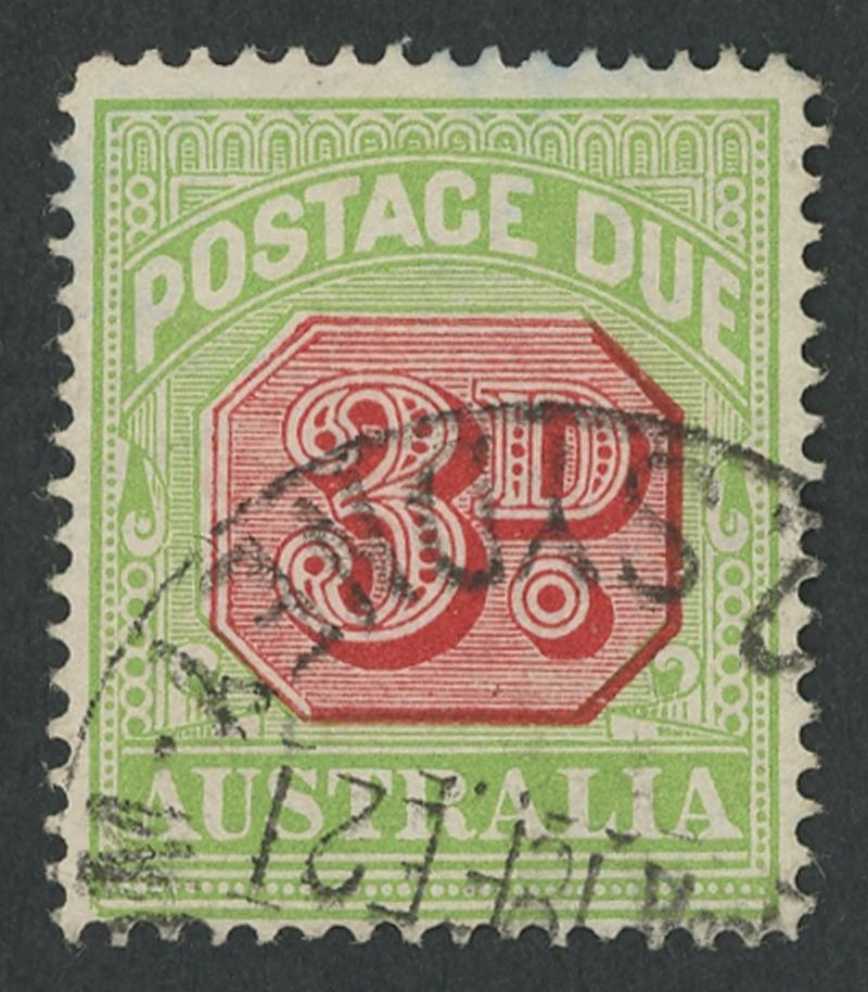 ACSC D101a (SG D83ba) strip of 3, light Perth bars cancel, Cat $2250+ (£1500+) for singles in the normal 'pale green' shade. The ACSC only records this variety "in the carmine and pale green shade ... very scarce ... "; this item shows that it also