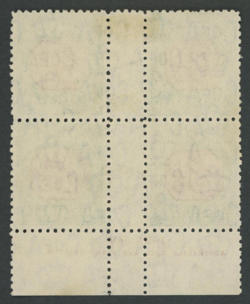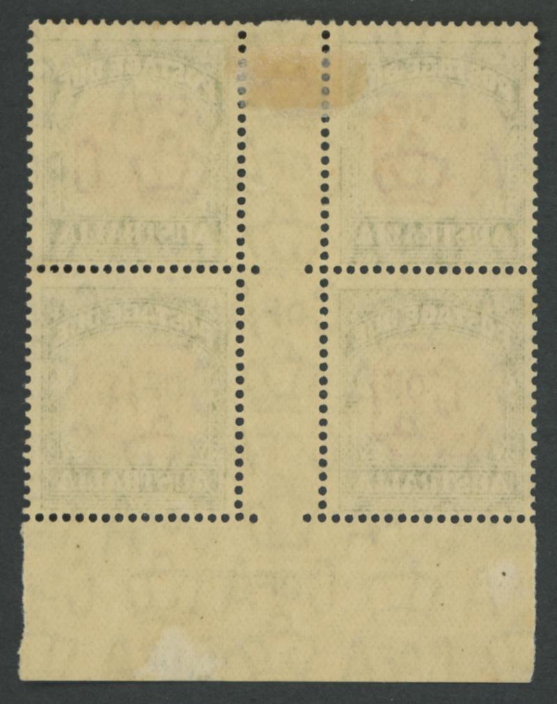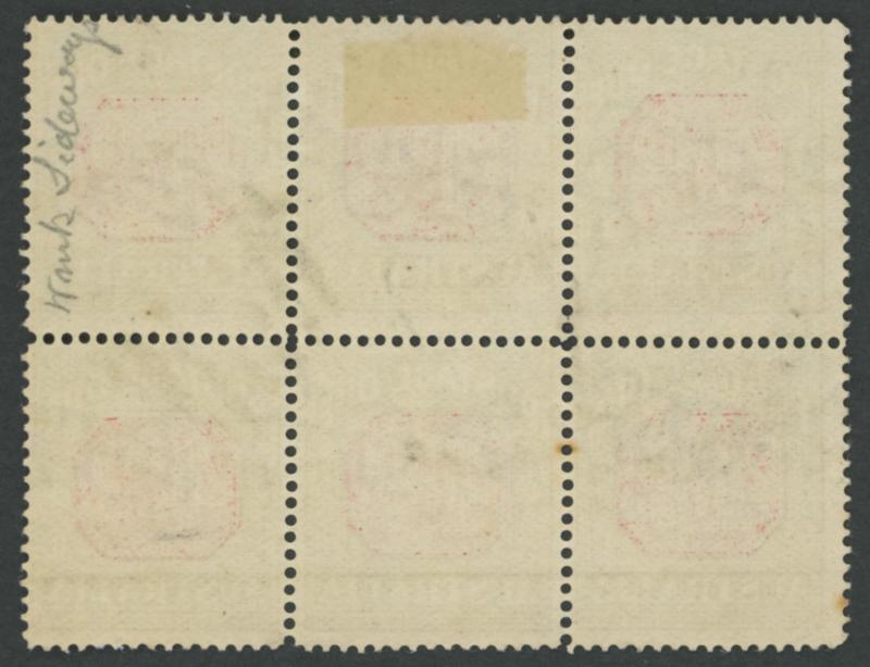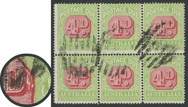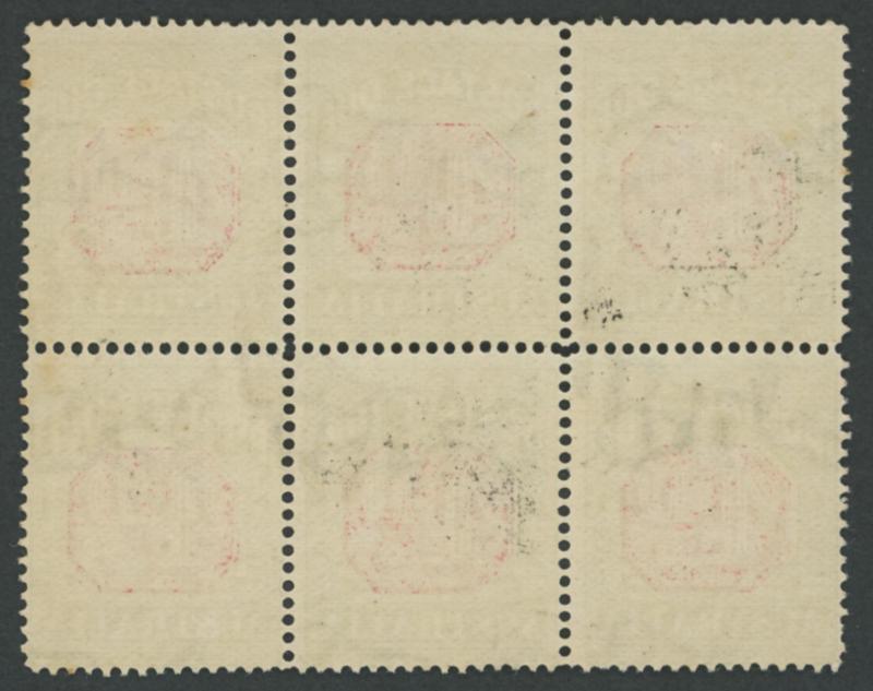 D101a (SG D83ba) block of 6 (3x2), the lower-left unit with Retouched Shading Right of 'D' [Pos C5] ACSC D101(VP)i, light but slightly untidy Perth bars cancel, Cat $4500+ (£3000+) for normal singles. The ACSC states " ... very scarce ... The only