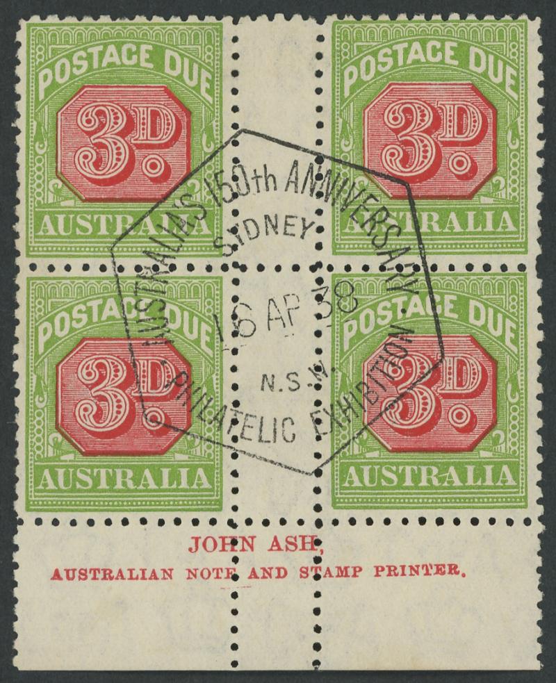 'U' of 'AUSTRALIA' and with 'RA' Joined ACSC D118za, central 'AUSTRALIA'S 150th ANNIVERSARY/SYDNEY/PHILATELIC EXHIBITION' hexagonal datestamp per favor cancel, no gum, Cat $1500 for mounted mint. (Image1) (Image2)