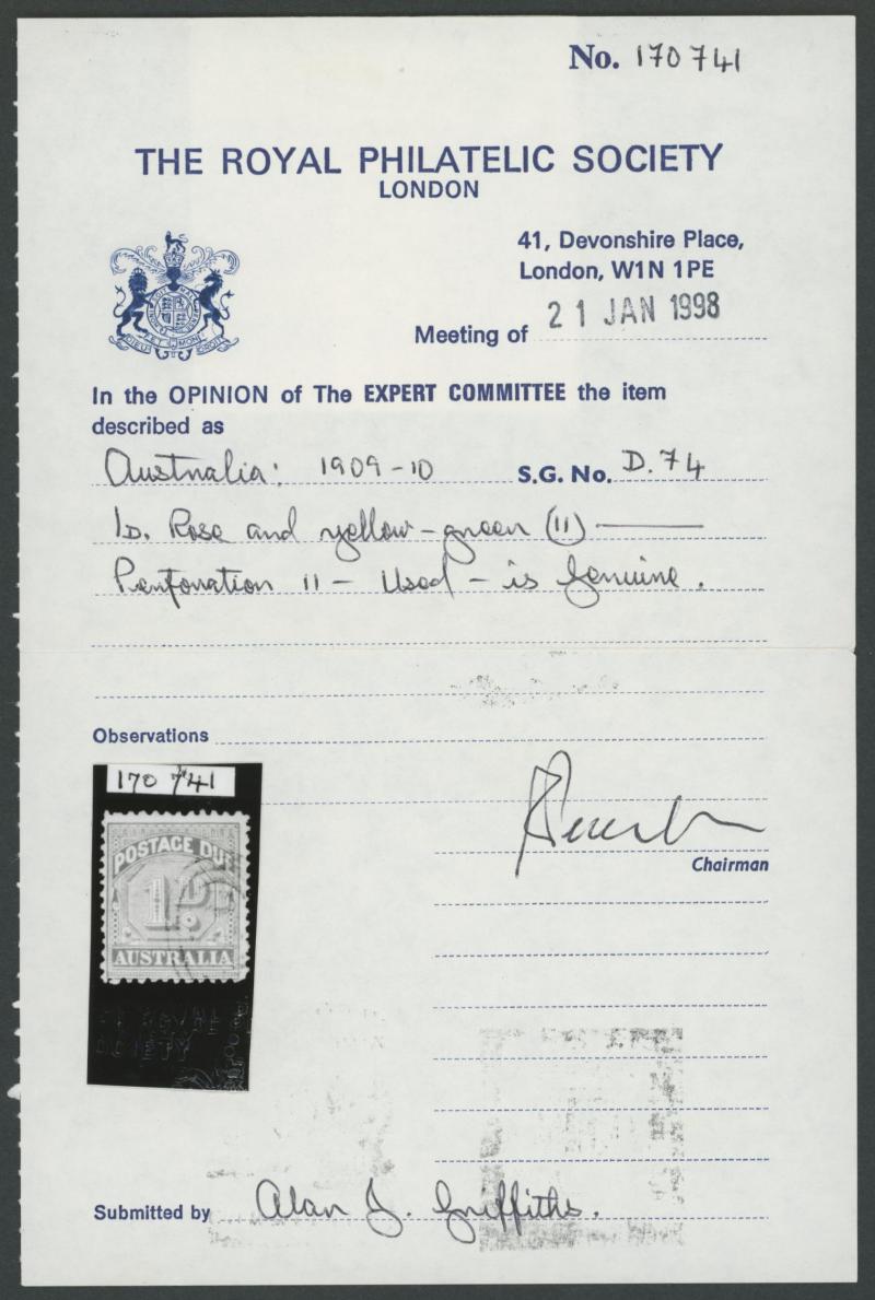 1909-10 Victorian Design Crown/Double-Lined A Watermark Thick Paper Single Line Perf 11 1d rosine & yellow-green ACSC D79 (SG D74),