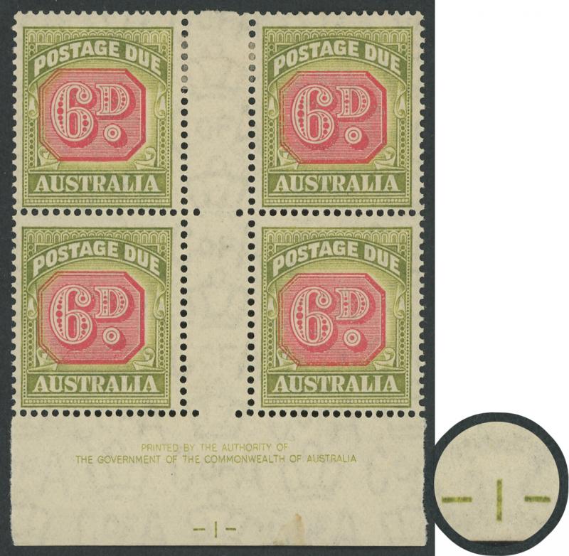 1946-56 Redrawn Value Plates 6d carmine and yellow-green SG D125 Authority Imprint block of 4 with complete Plate Number '-1-' at