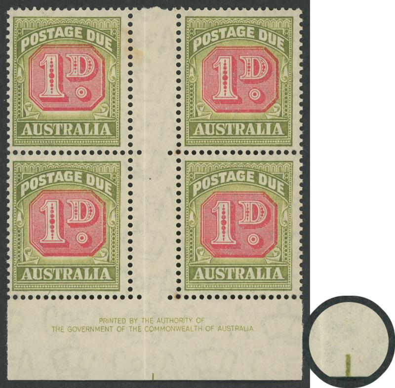1946-56 Redrawn Value Plates 1d carmine and yellow-green SG D120 Authority Imprint block of 4 with near-complete Plate Number ' 1 '