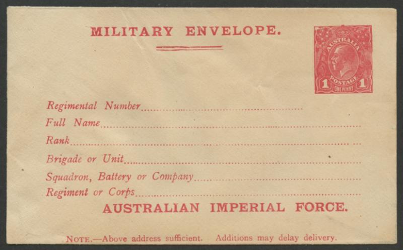 ENVELOPES - MILITARY: 1916 'AUSTRALIAN IMPERIAL FORCE' 1d red with Re-Set Text 'Full Name / Rank' ACSC ME2, the stamp with White