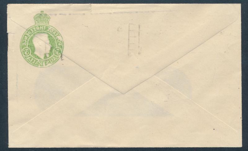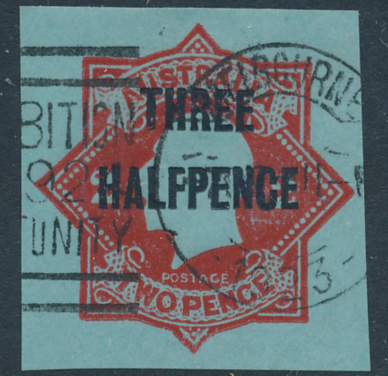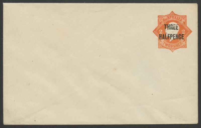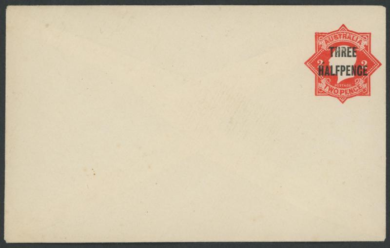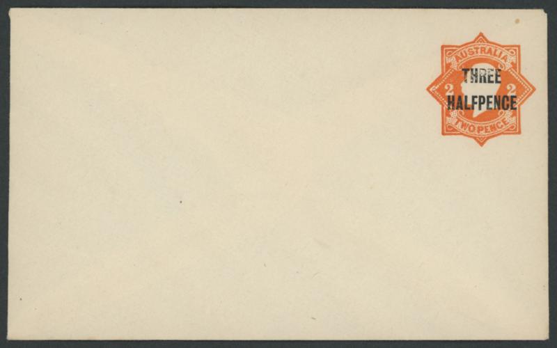 ENVELOPES: 1923 'THREE/HALFPENCE' on Star 2d orange Without 'POSTAGE' ACSC EP24, unusually fine for this issue, Cat $750. The ACSC