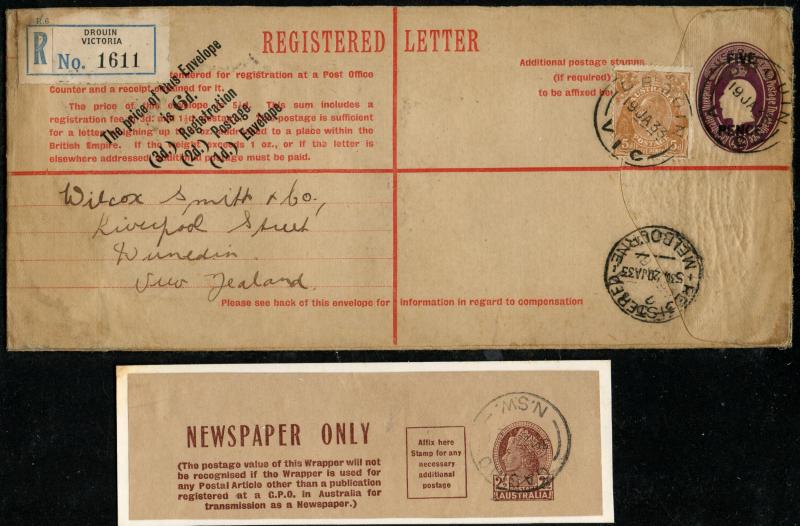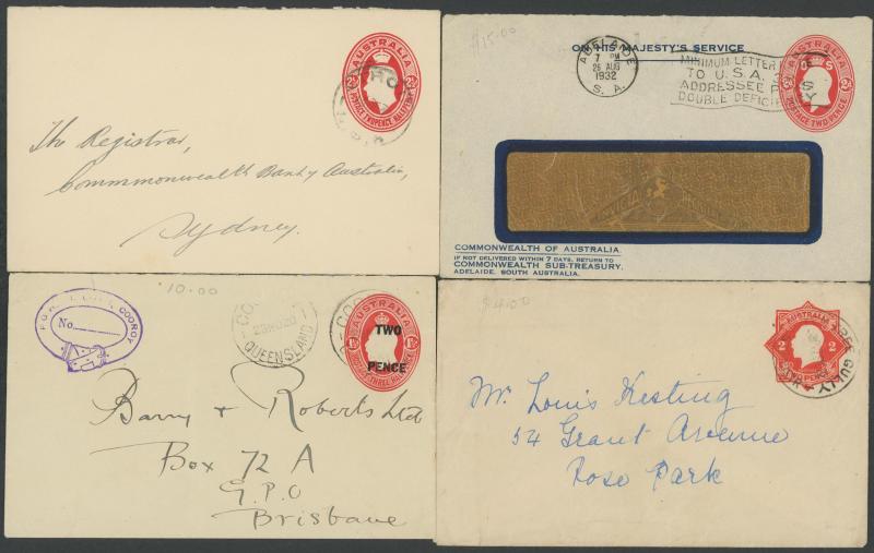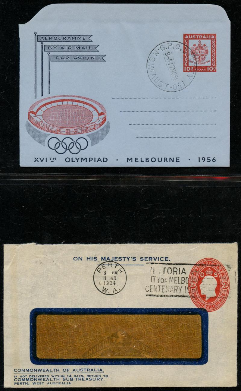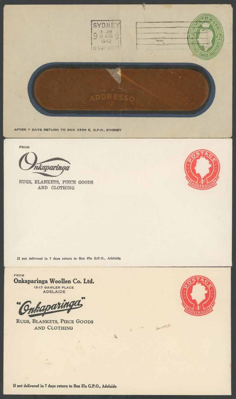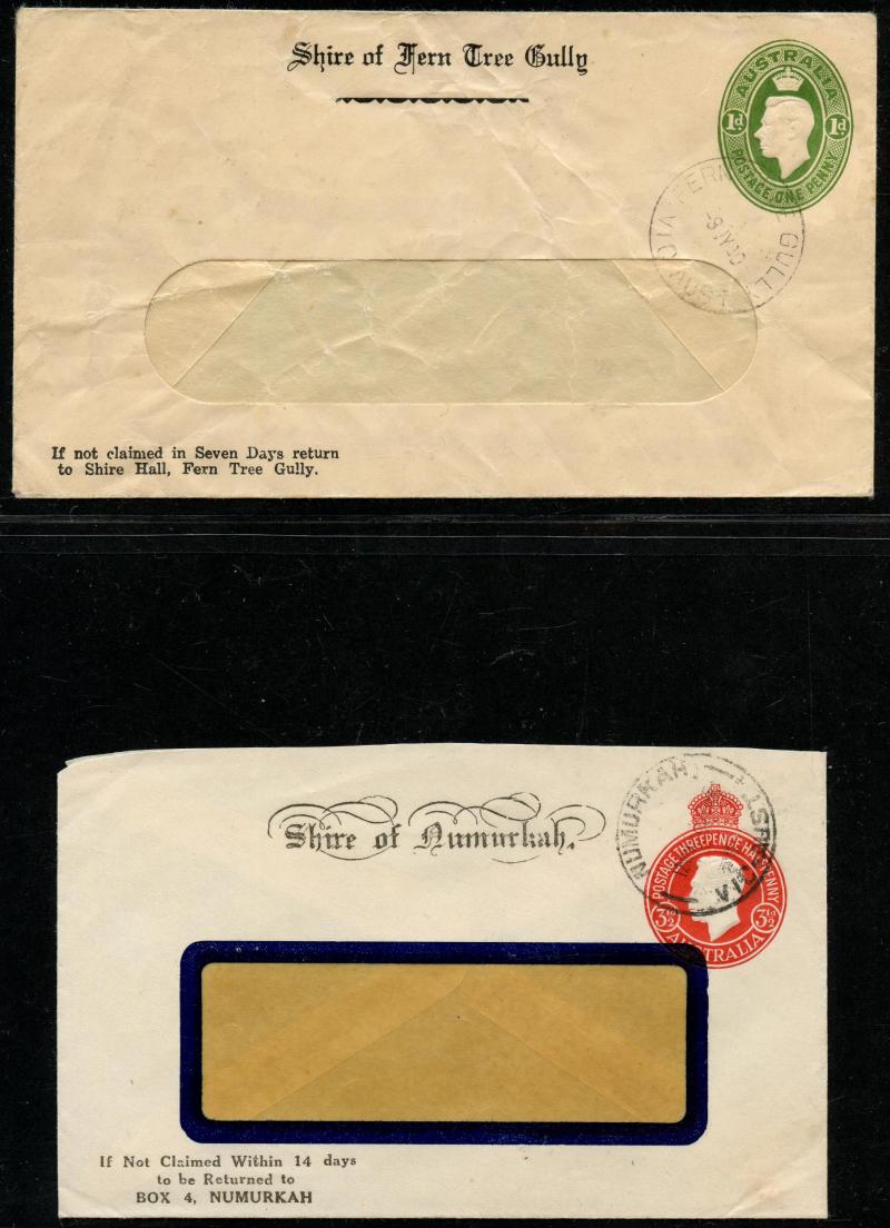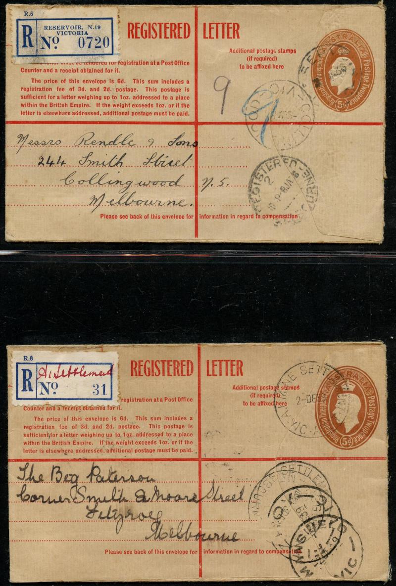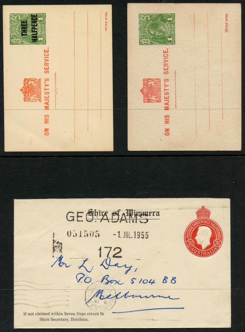 both unused, and KGV 1½d brown with printed 'SECOND CLASS MAIL MATTER', Registered Envelope KGVI 5d with 'A.1.MINE SETTLEMENT/VIC-AUST' cds & manuscript on blue R label, plus a few STO Envelopes for municipalities and OHMS long-format KGV 1d red