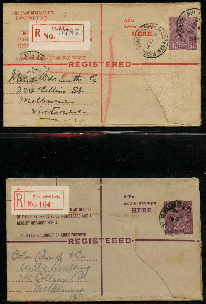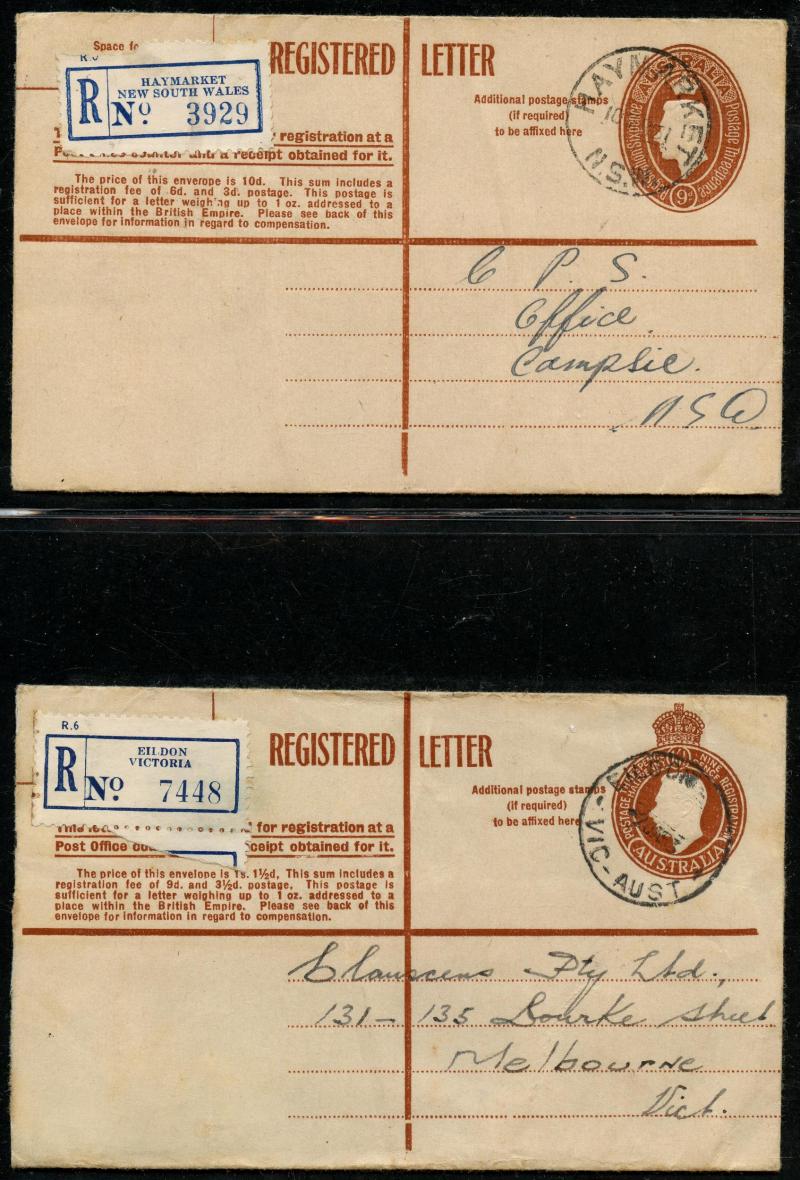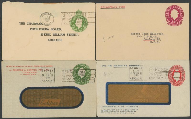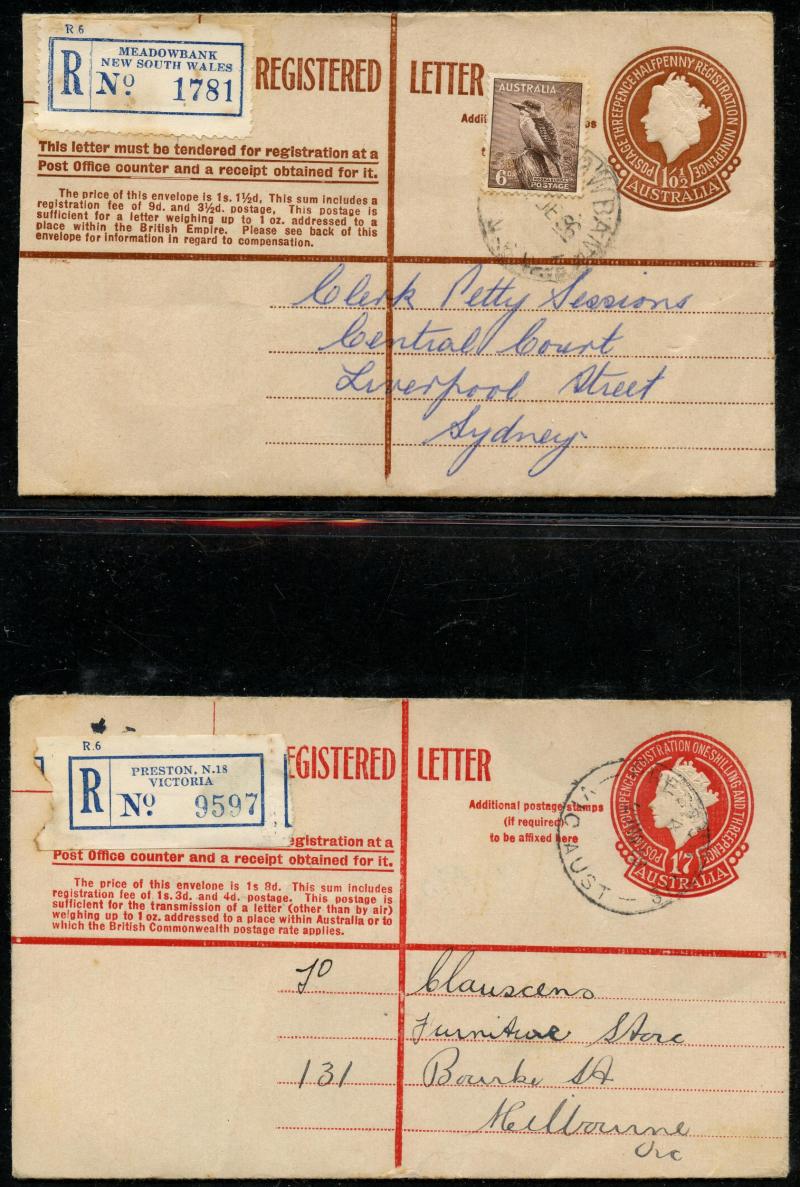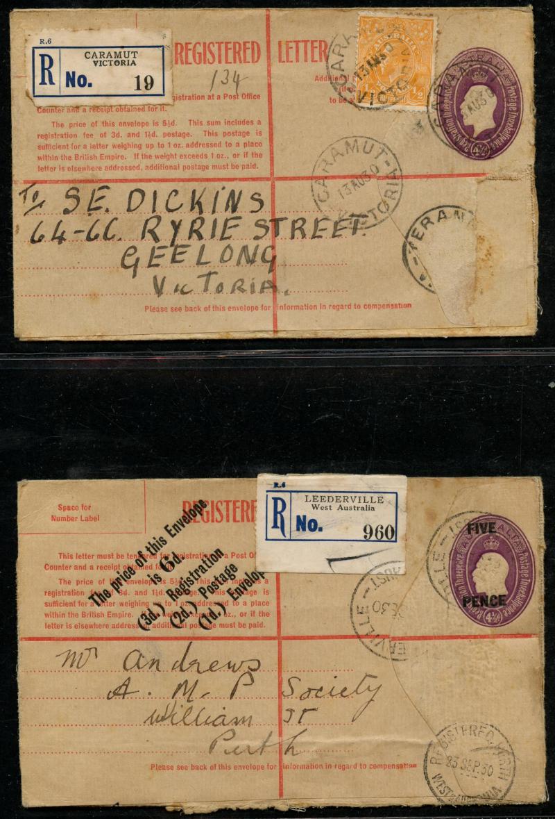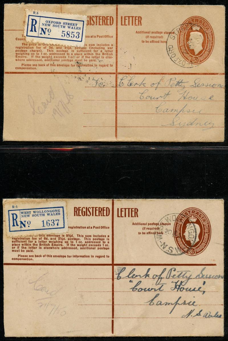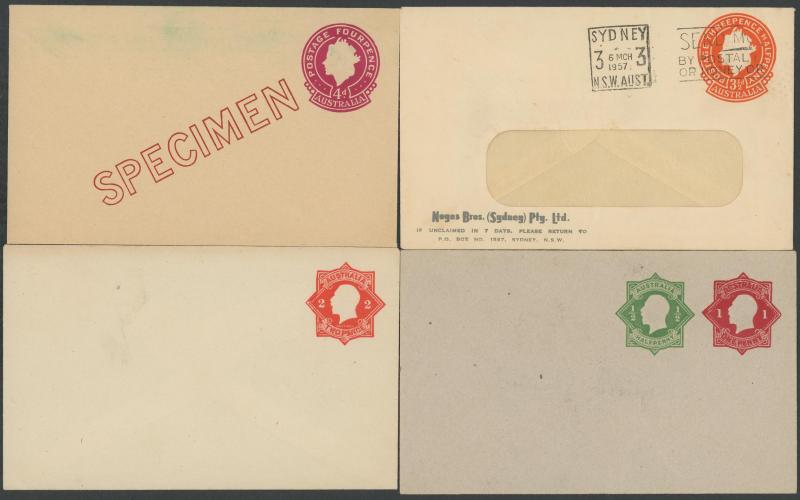 both unused, and KGV 1½d brown with printed 'SECOND CLASS MAIL MATTER', Registered Envelope KGVI 5d with 'A.1.MINE SETTLEMENT/VIC-AUST' cds & manuscript on blue R label, plus a few STO Envelopes for municipalities and OHMS long-format KGV 1d red