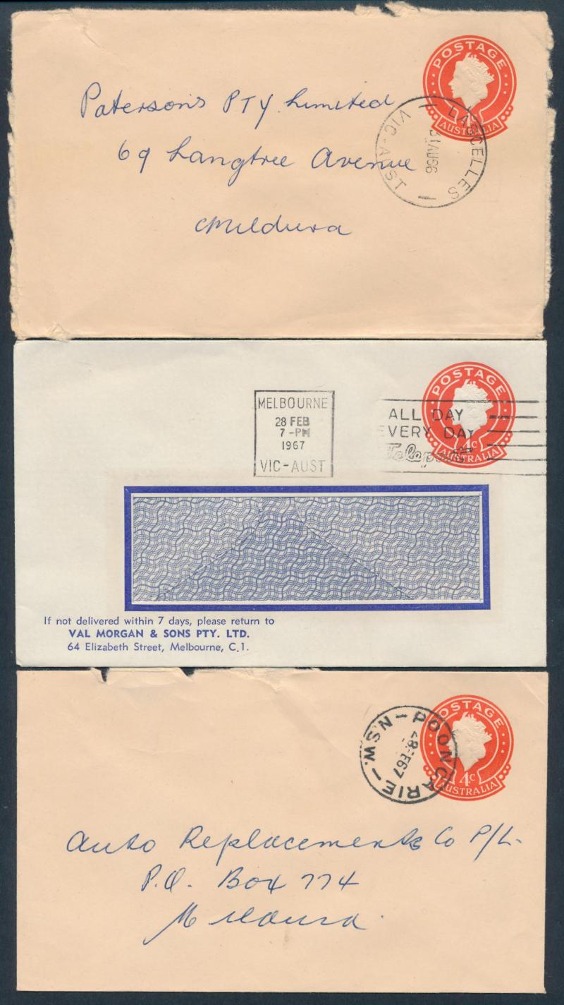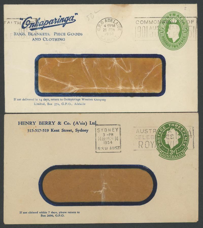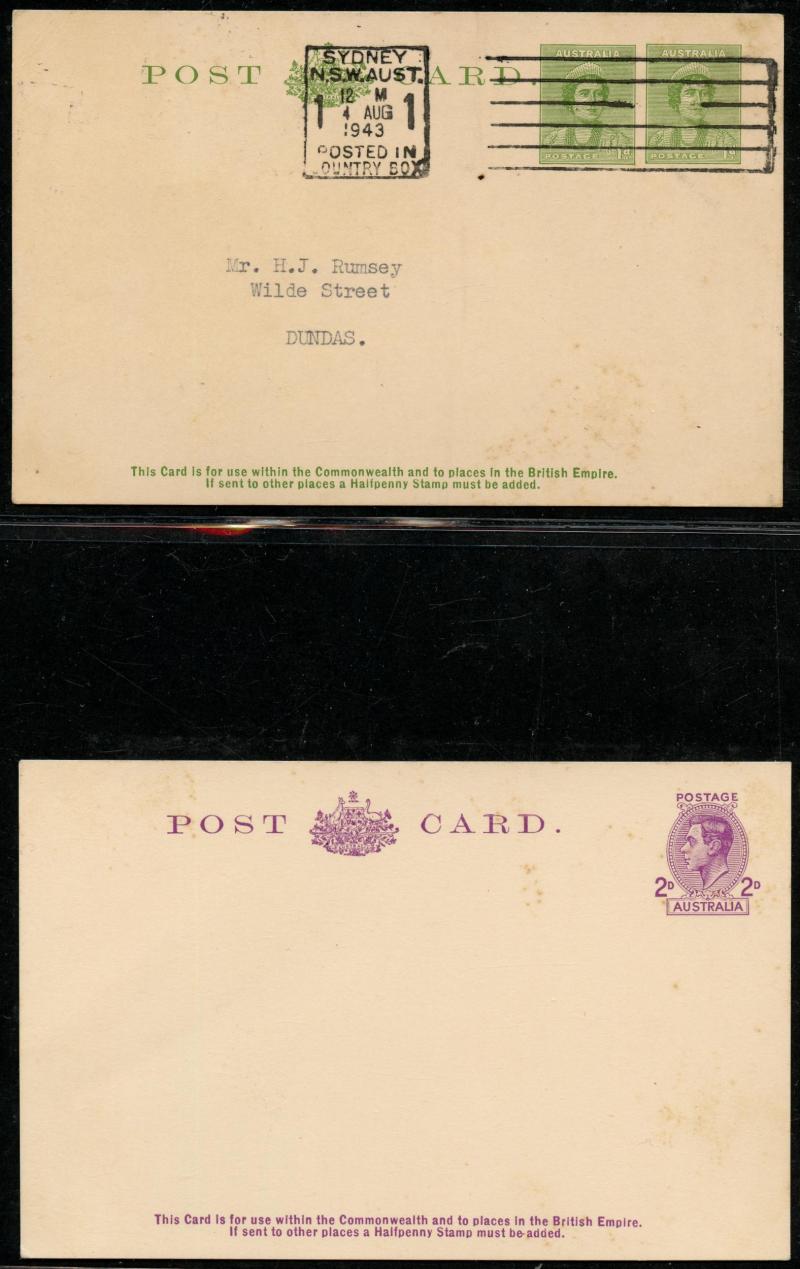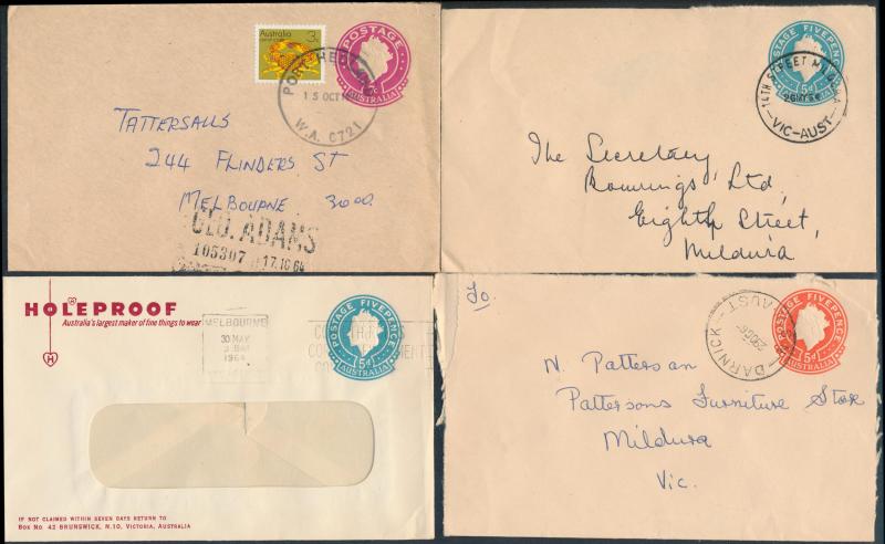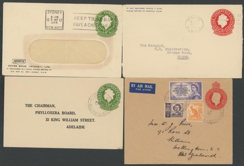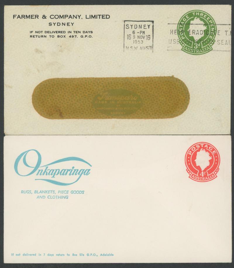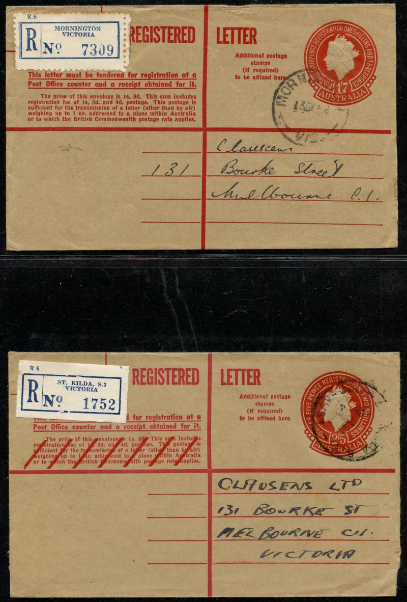 both unused, and KGV 1½d brown with printed 'SECOND CLASS MAIL MATTER', Registered Envelope KGVI 5d with 'A.1.MINE SETTLEMENT/VIC-AUST' cds & manuscript on blue R label, plus a few STO Envelopes for municipalities and OHMS long-format KGV 1d red