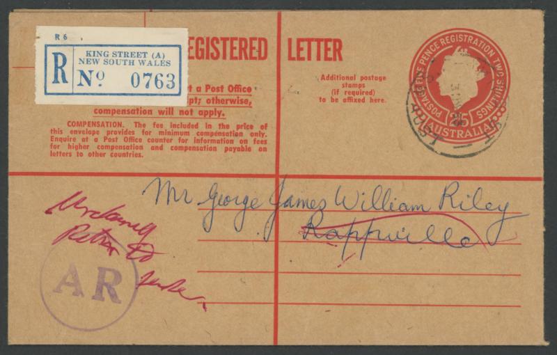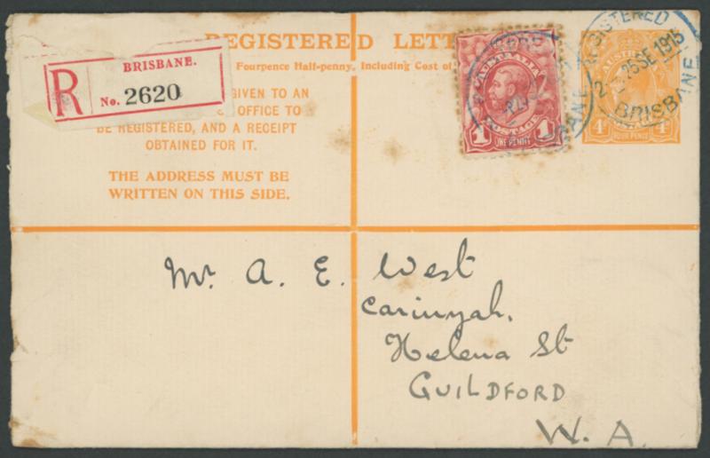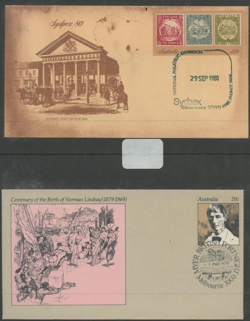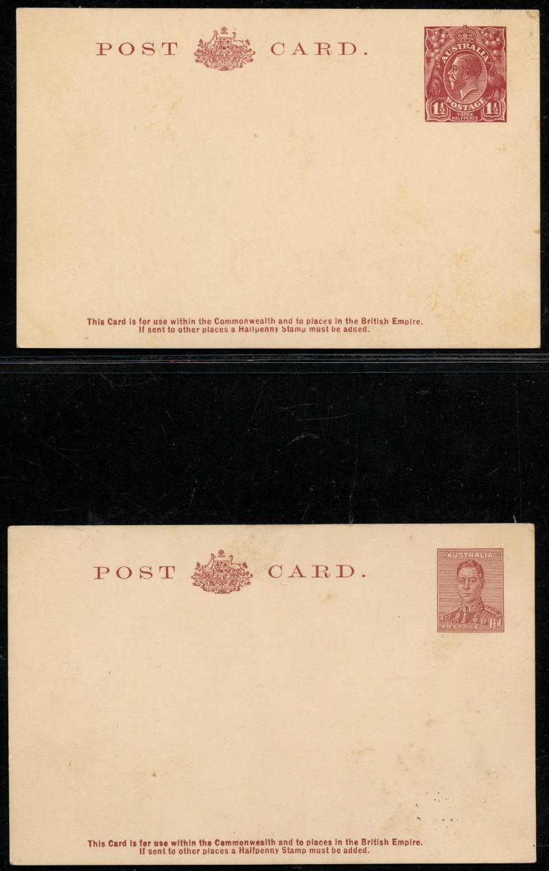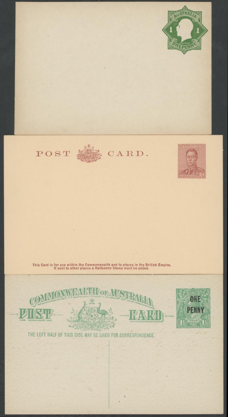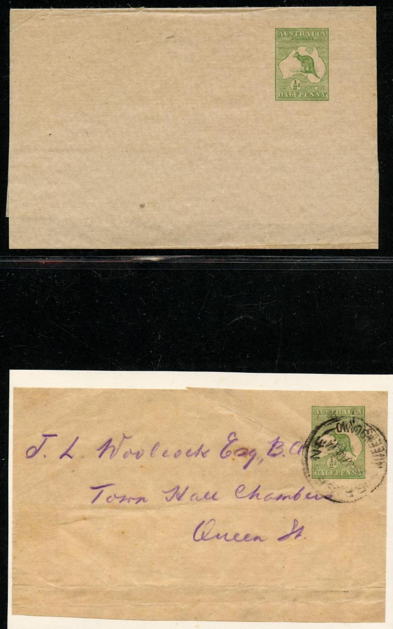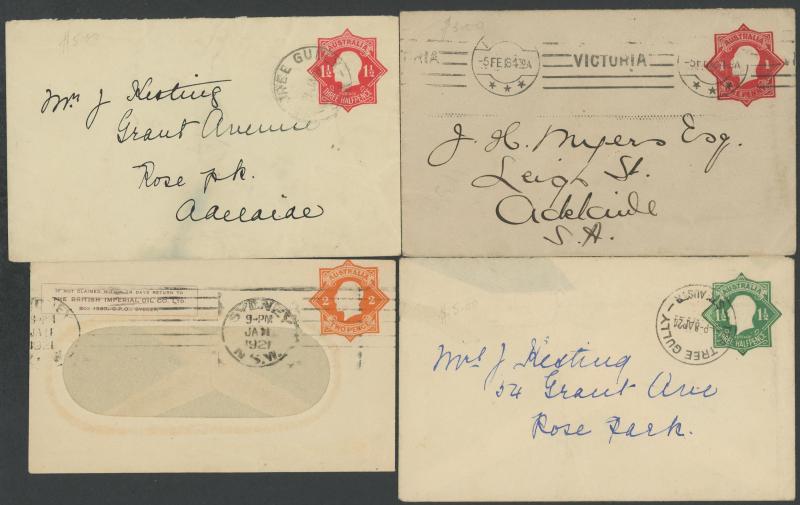 both unused, and KGV 1½d brown with printed 'SECOND CLASS MAIL MATTER', Registered Envelope KGVI 5d with 'A.1.MINE SETTLEMENT/VIC-AUST' cds & manuscript on blue R label, plus a few STO Envelopes for municipalities and OHMS long-format KGV 1d red